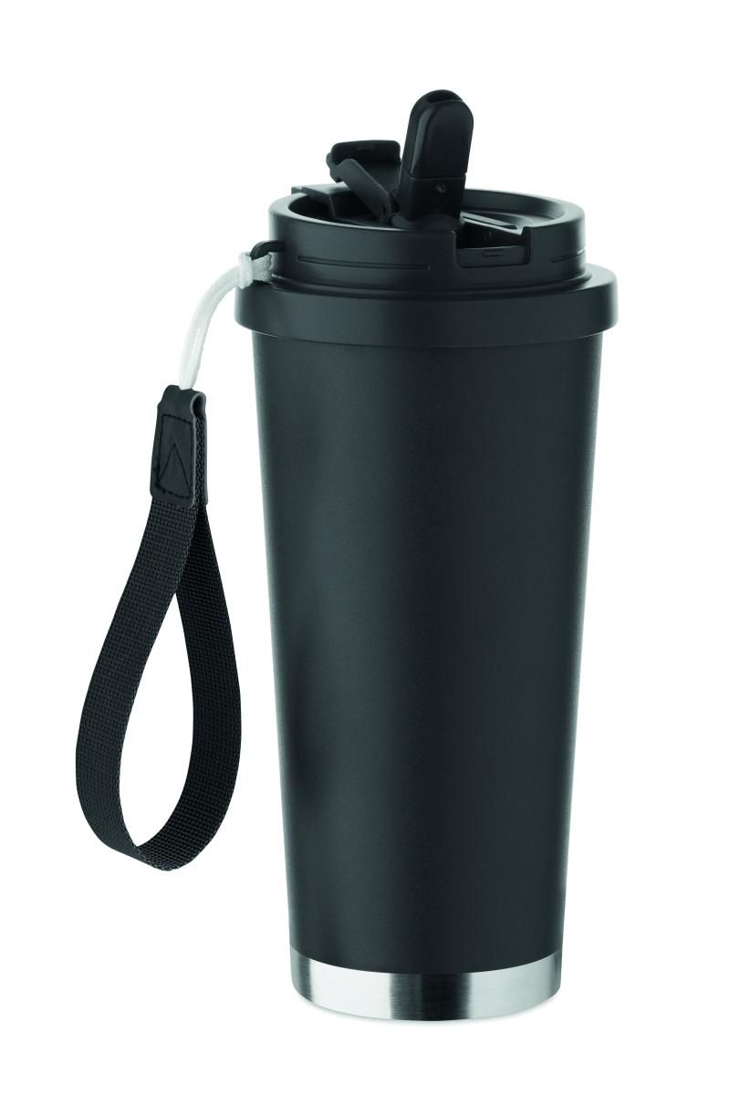 Vaso de acero inoxidable reciclado de doble pared con tapa de PP (tapa 2 en 1 para beber y pajita) y con correa de transporte de RPET. Anti fugas. Capacidad: 500 ml.