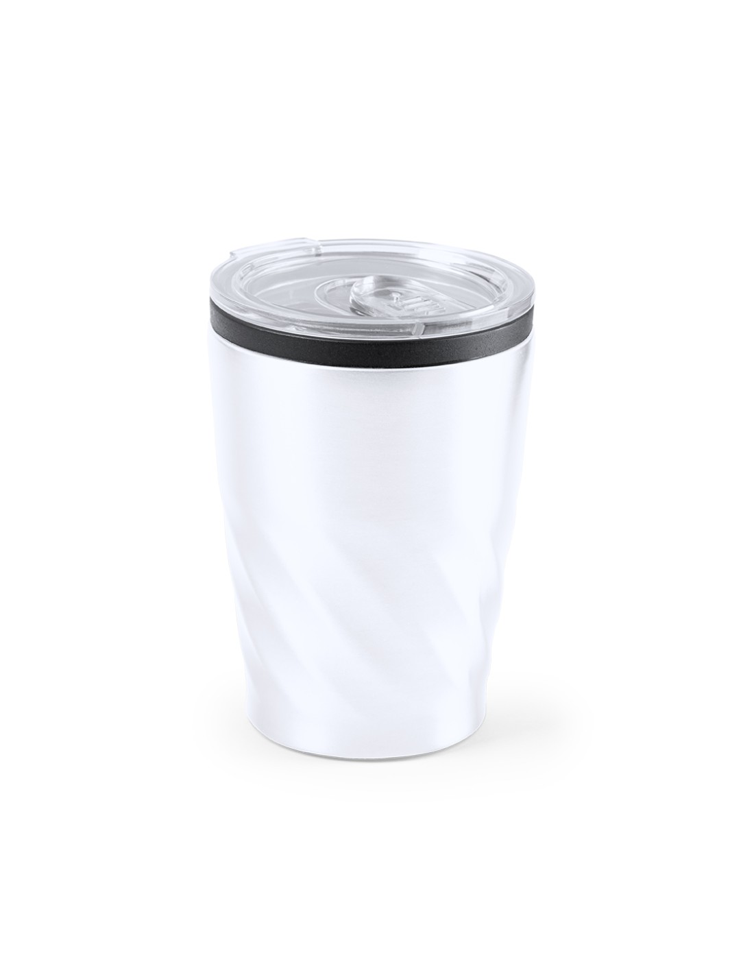 Vaso fabricado en acero inox de 350ml de capacidad. Cuerpo con diseño biselado, con anilla de color negro. Con original tapón dosificador transparente y abrefácil. Es ideal para tener en tu escritorio, mesa o en cualquier superficie donde disfrutar tranquilamente de tu bebida favorita.