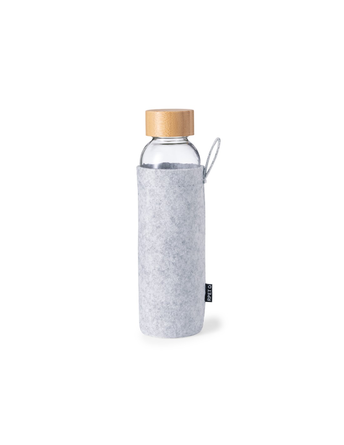 Bidón de 500 ml de capacidad. Fabricado en resistente cristal y con tapón a rosca de bambú. Incluye funda de suave fieltro RPET con práctica asa de transporte. Libre de BPA. Con etiqueta distintiva RPET. Presentado en caja individual de diseño eco.El fieltro RPET reciclado es fruto de la combinación del proceso de reciclaje de materiales plásticos junto a la técnica milenaria de fabricación del fieltro, dando como resultado un material de eco-tendencia que, además de ser de origen reciclado, también se convierte en reciclable.