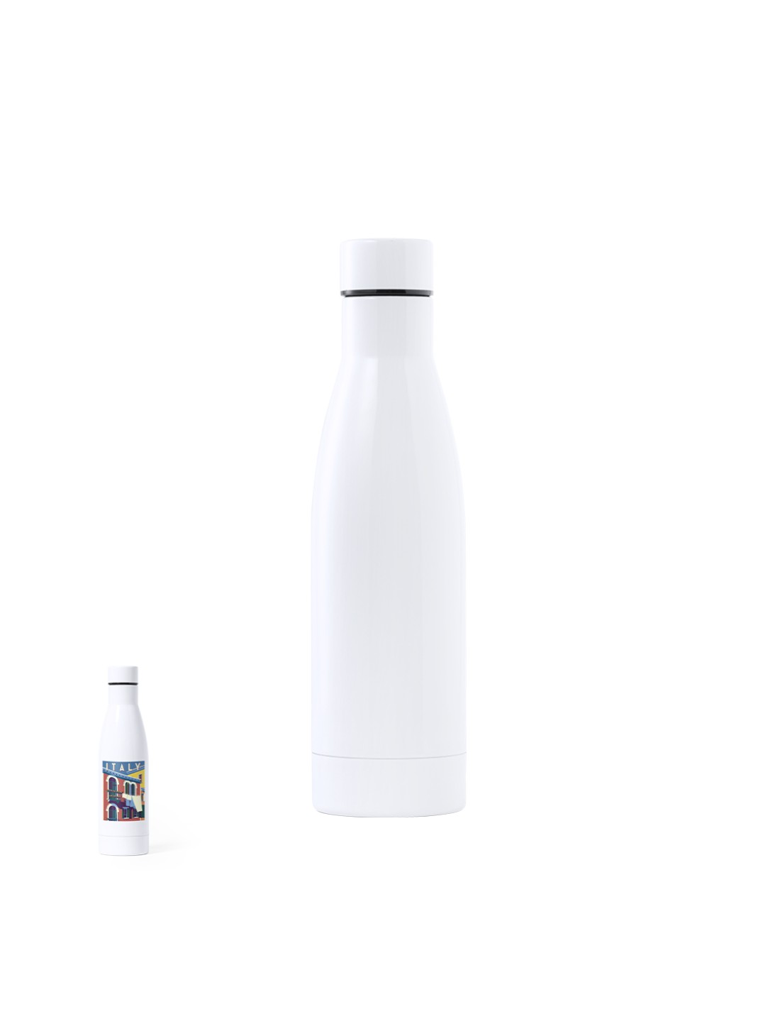 Bidón de acero inox de 700ml de capacidad. Acabado en suave y brillante color blanco, especialmente diseñado para marcaje en sublimación. Con tapón...