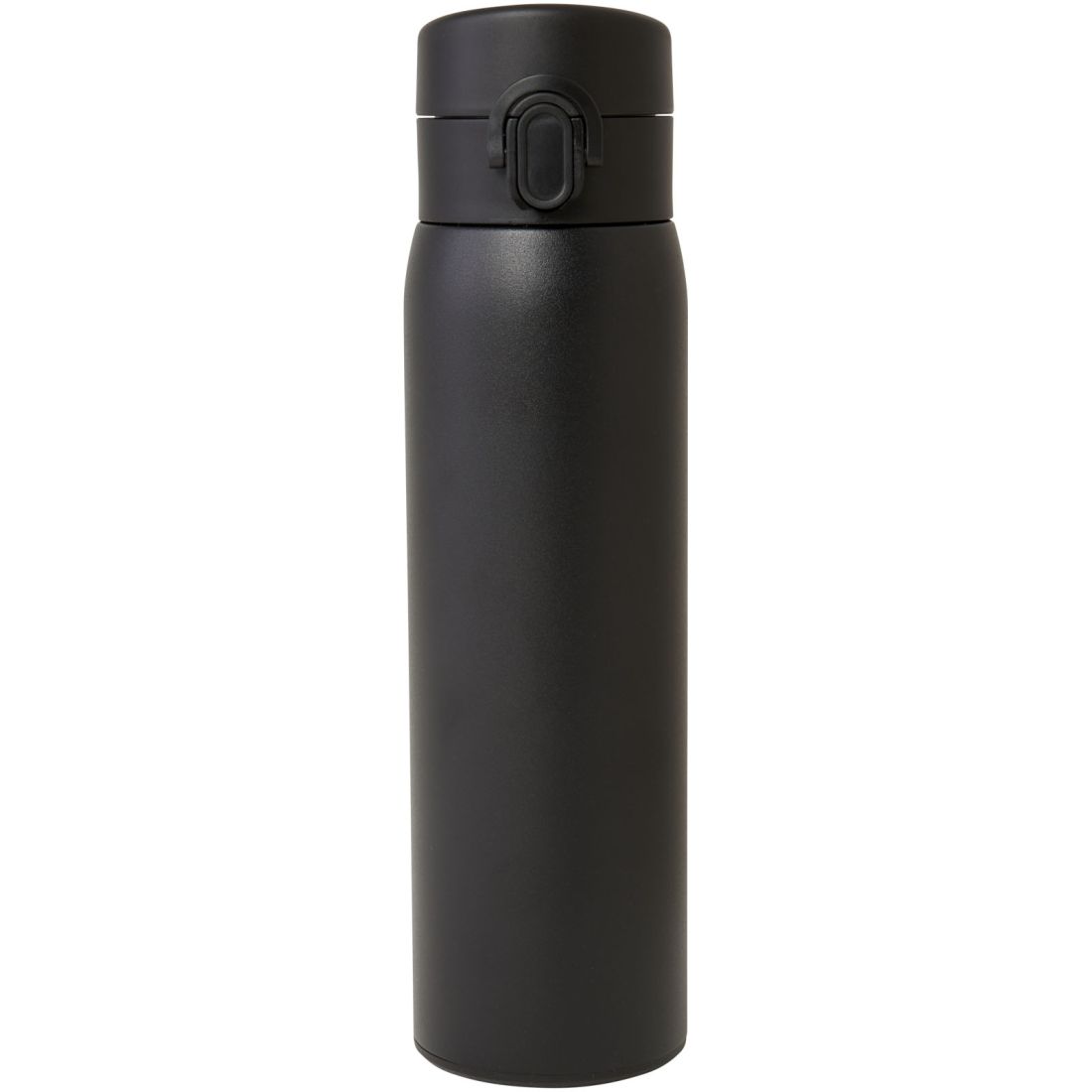 Elegante termo con aislamiento de acero inoxidable reciclado con certificación RCS y sencillo mecanismo de apertura mediante un botón. El termo es hermético y, gracias a su aislamiento de cobre, las bebidas se mantendrán calientes o frías durante varias horas. Capacidad de 450 ml. Se presenta en una caja de regalo de cartón reciclado.