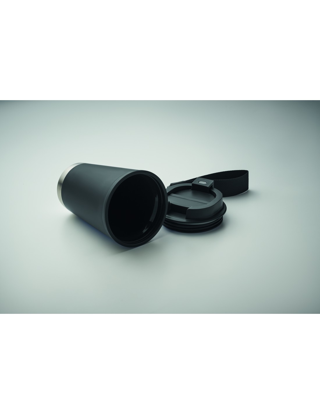 Vaso de doble pared con pared interior de PP, pared exterior de PP reciclado, detalle de acero inoxidable reciclado y correa de RPET. Capacidad: 300 ml.