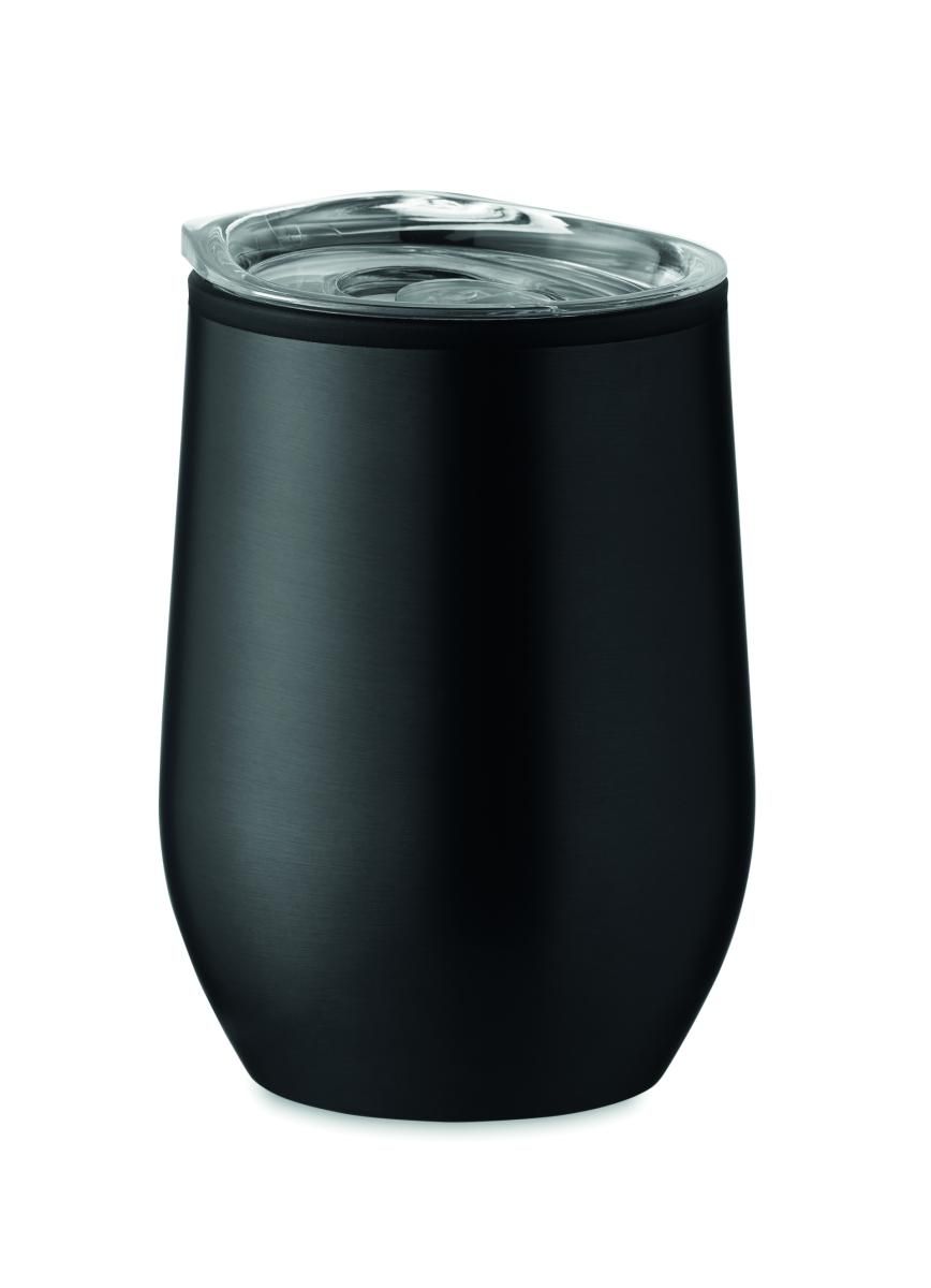Vaso de acero inoxidable de doble pared con PP interior y tapa de PS transparente. Capacidad: 350 ml.