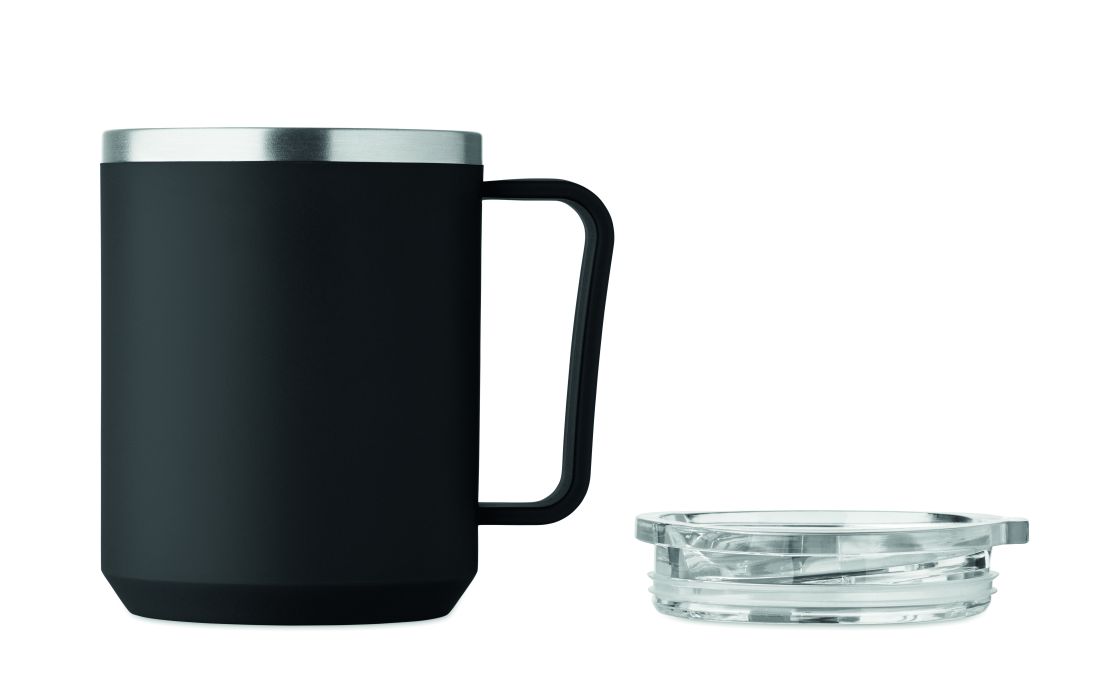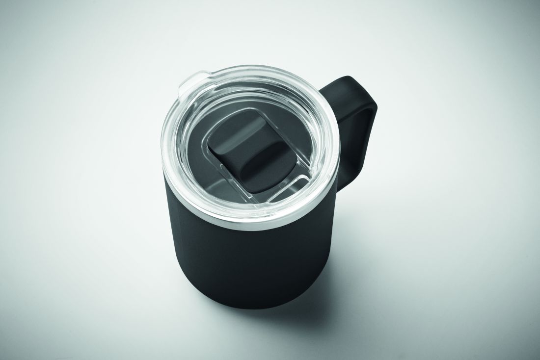 Vaso de doble pared con interior de acero inoxidable 90% reciclado y 10% de acero inoxidable y exterior de PP reciclado. Incluye tapa deslizante AS transparente. Capacidad 400 ml.