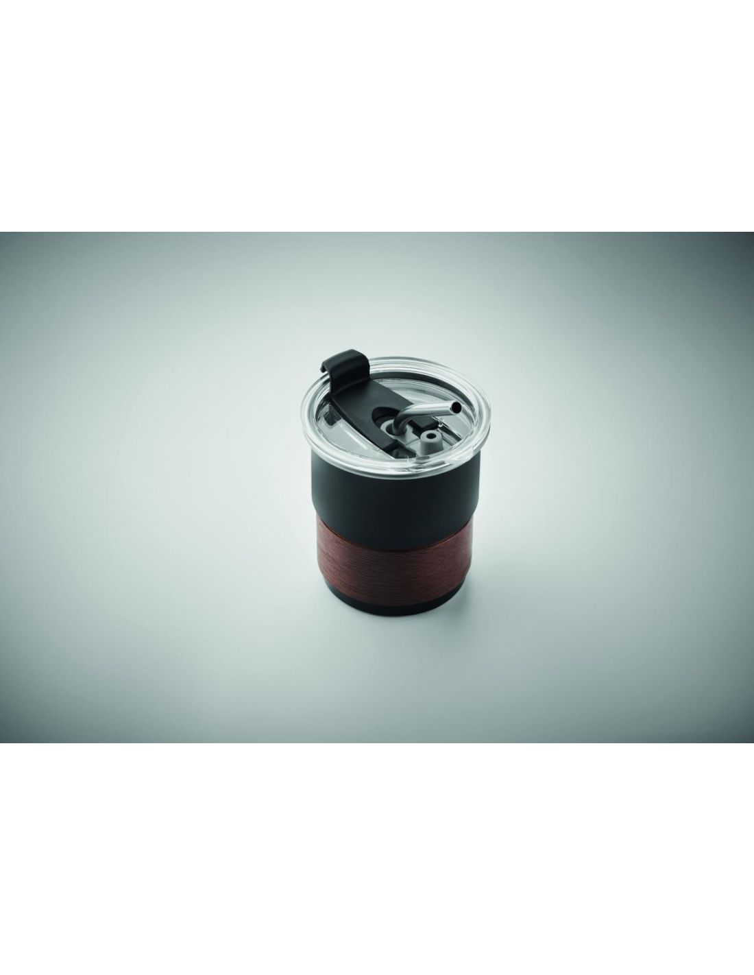 Vaso de pared simple de acero inox. reciclado (90% acero inox. reciclado y 10% acero inox) con revestimiento desmontable de madera de acacia y pajita de acero inoxidable. Tapa de apertura. Antifugas. Capacidad: 260 ml. Al tratarse de un vaso de una sola pared, puede producirse una transferencia de calor.
