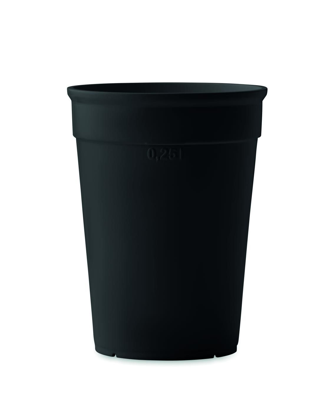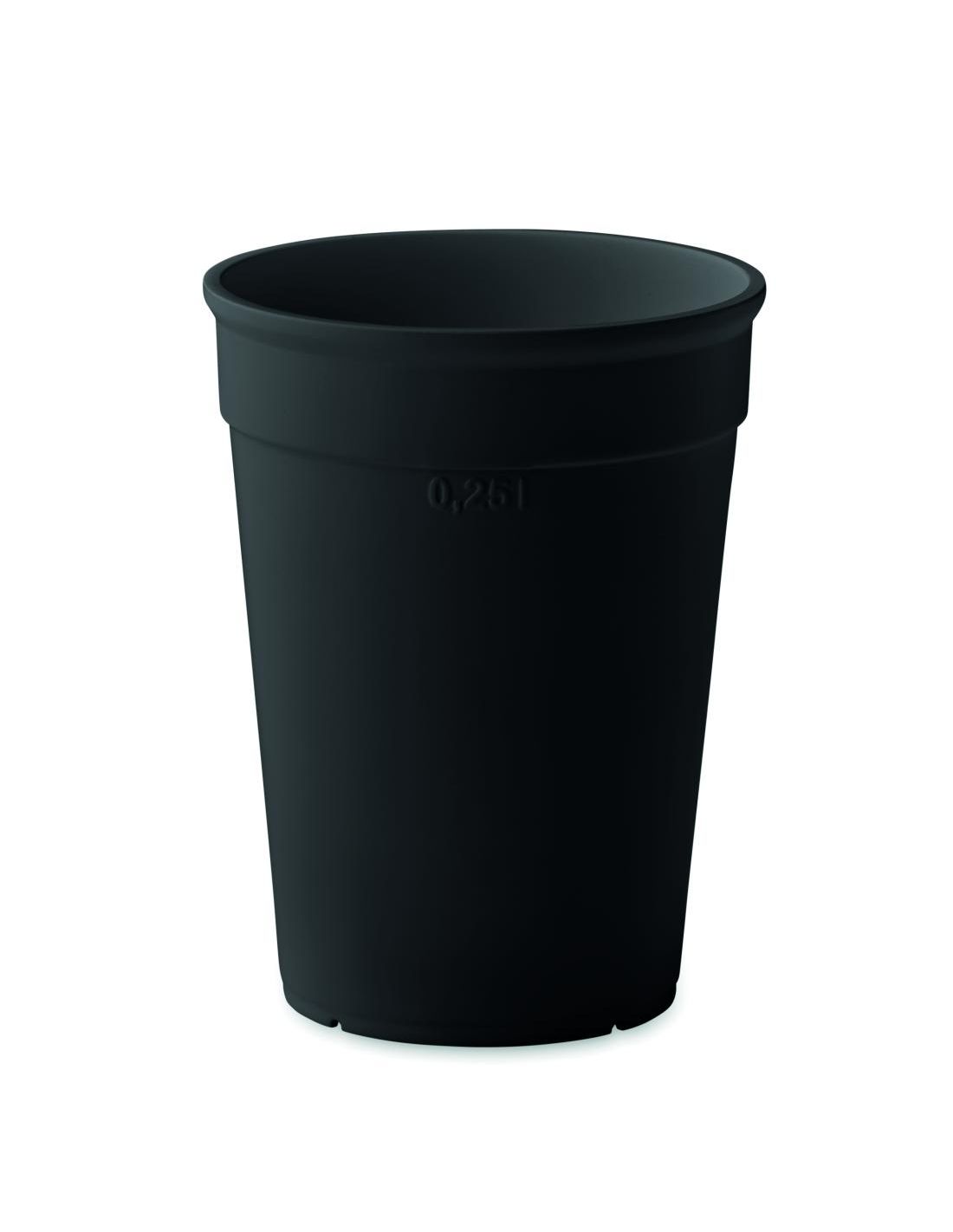 Vaso reutilizable de pared simple en PP. Capacidad: 250 ml. Al tratarse de un vaso de una sola pared, puede producirse una transferencia de calor.
