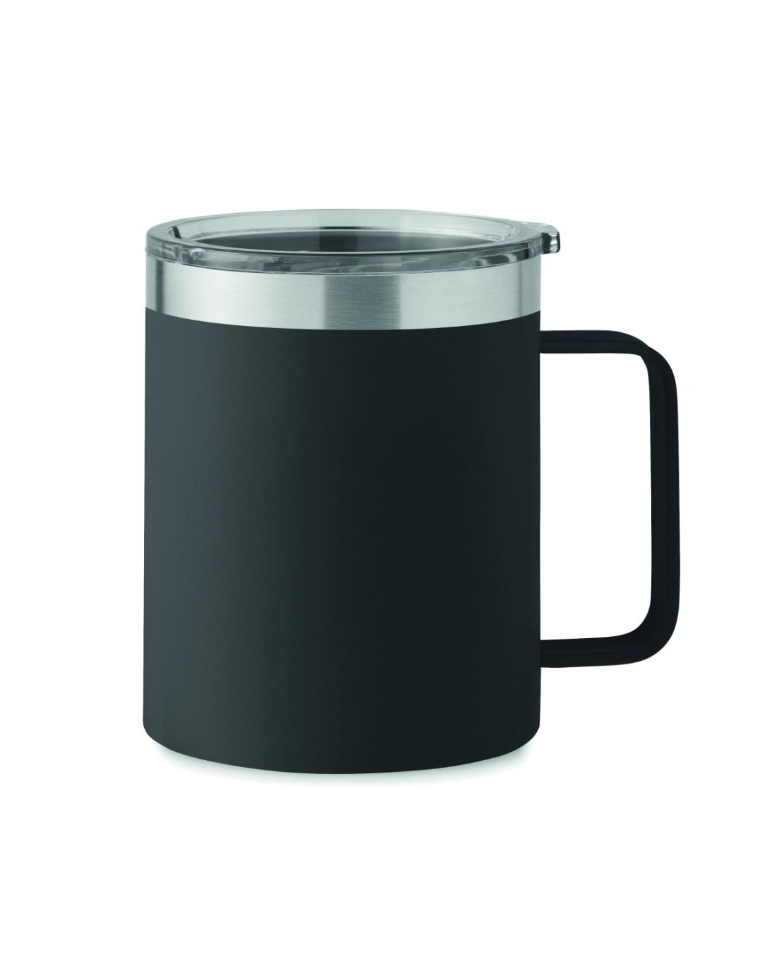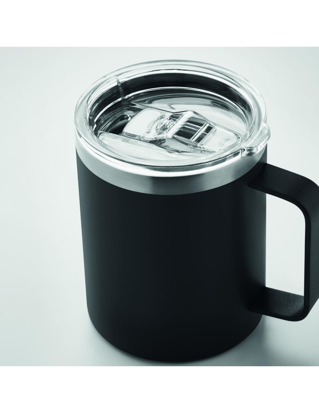 Vaso de acero inoxidable reciclado de doble pared (90% de acero inoxidable reciclado y 10% de acero inoxidable) con tapa y orificio deslizante para beber. Capacidad: 300 ml.