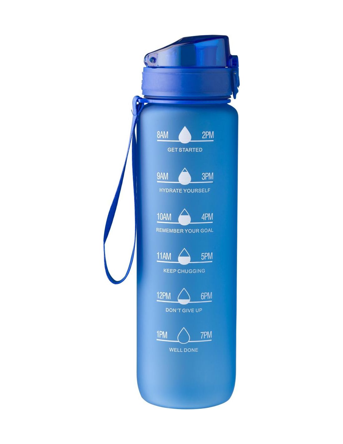 Botella de rPET (1 litro) con acabado mate, tapa antigoteo y cinta para la muñeca. Tiene impresa la capacidad en un lado y las horas como recordatorio para beber. Recomendable para uso de agua fría. Evitar bebidas ácidas o con gas.