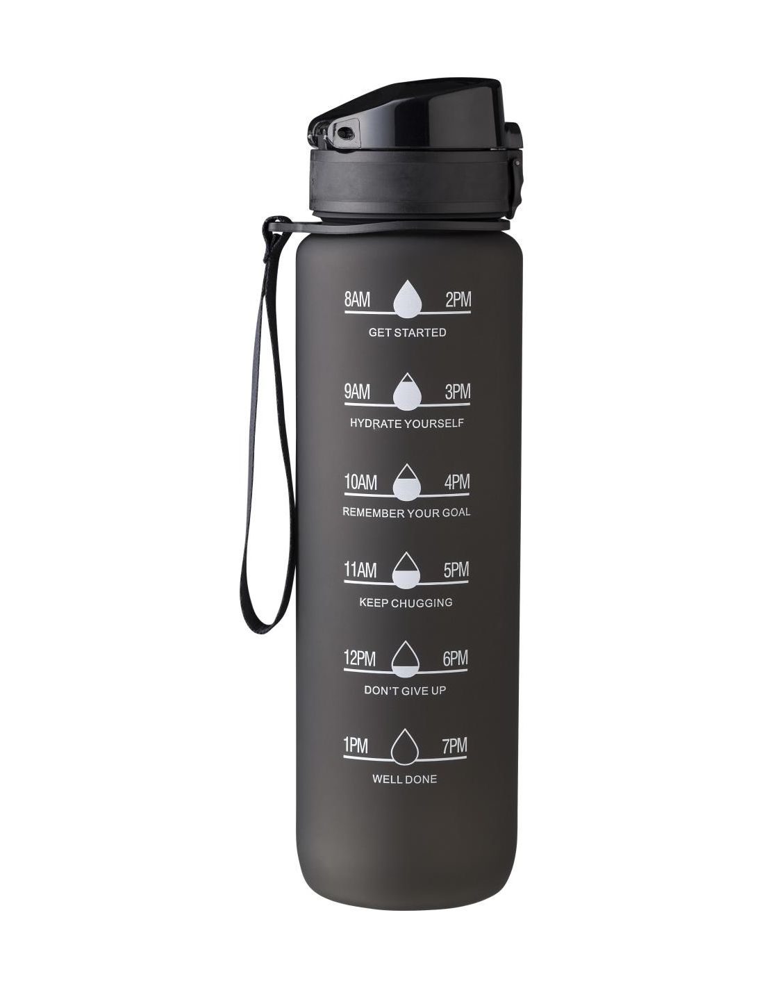 Botella de rPET (1 litro) con acabado mate, tapa antigoteo y cinta para la muñeca. Tiene impresa la capacidad en un lado y las horas como recordato…