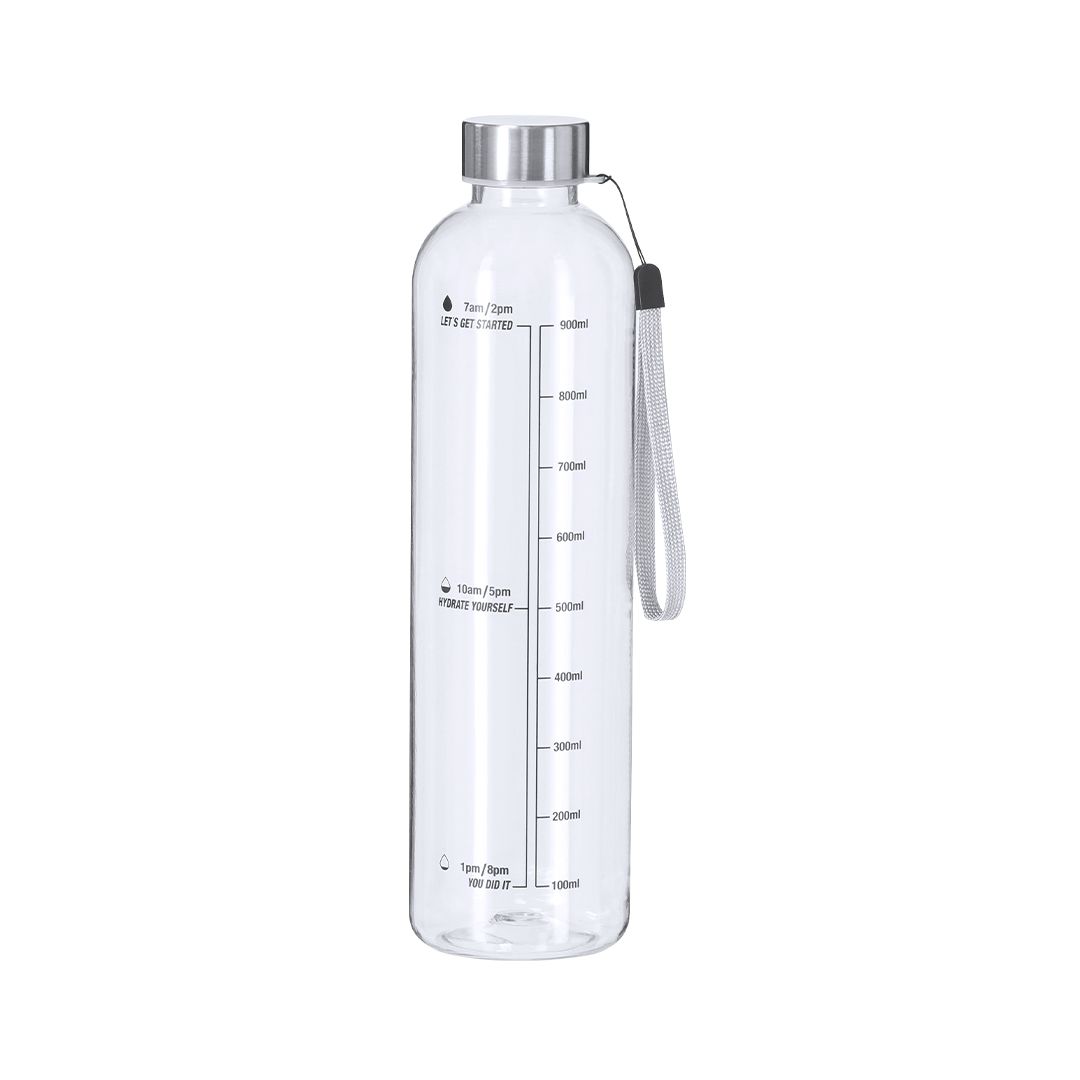 Bidón fabricado en RPET de 1L de capacidad, diseñado para fomentar una hidratación adecuada. Con cuerpo transparente. Incluye indicador de capacidad en litros y onzas, acompañado de frases motivadoras que inspiran a mantener una correcta hidratación diaria. Tapón, elaborado en Acero Inox, incluye práctico cordón para facilitar su transporte. Libre de BPA.