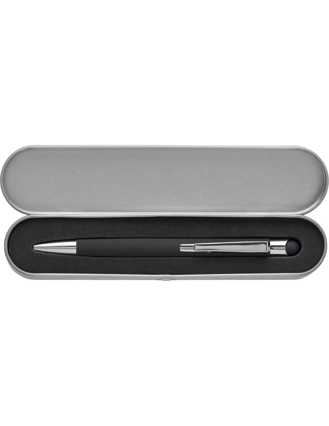 Bolígrafo de aluminio con revestimiento de caucho y puntero táctil. Presentado en un estuche de metal. Tinta negra.
