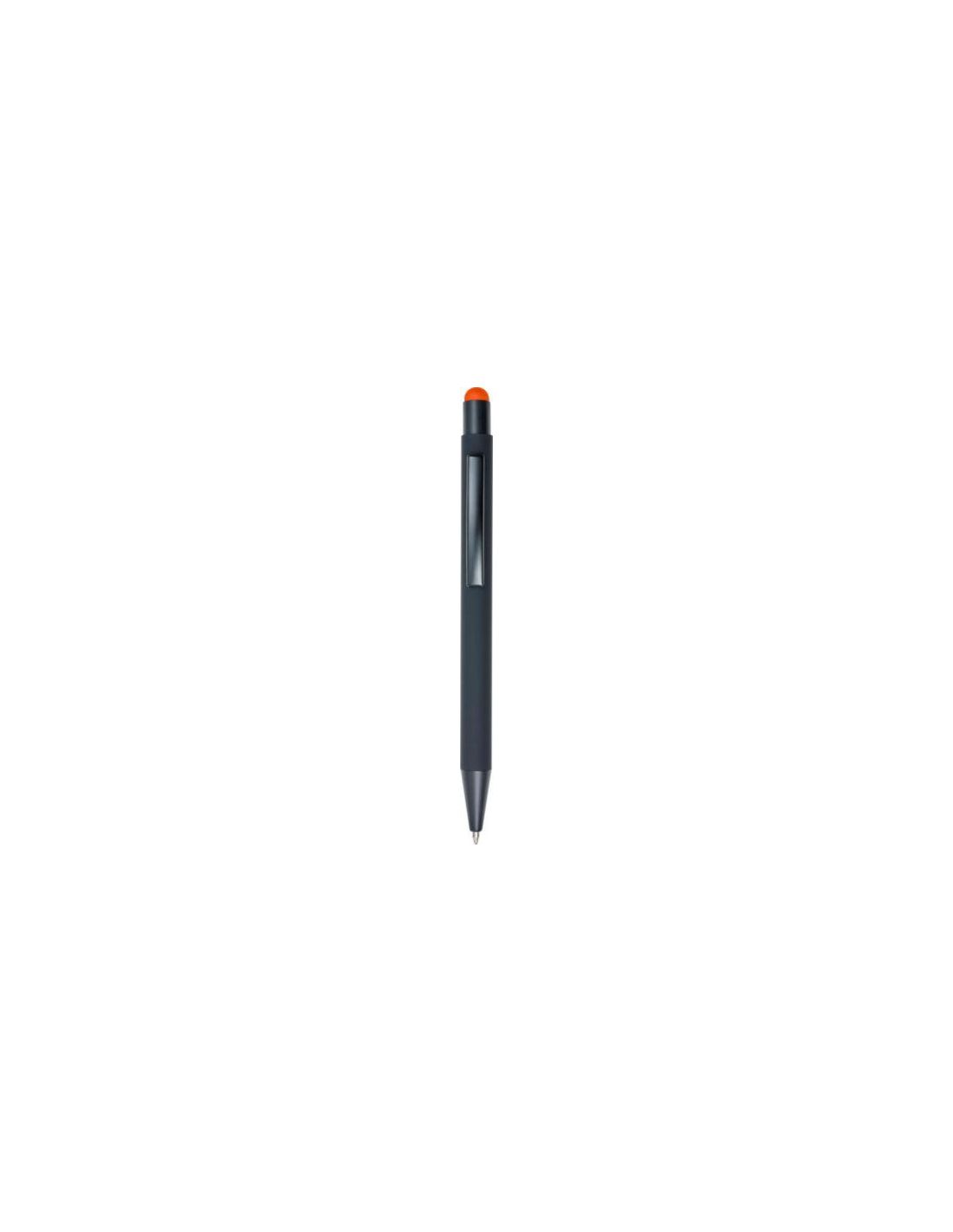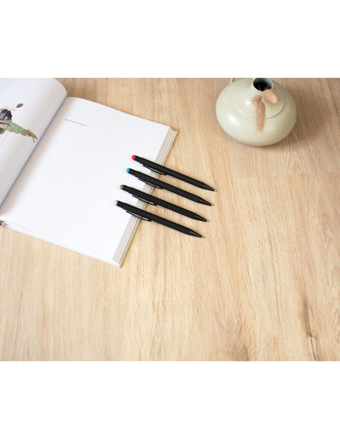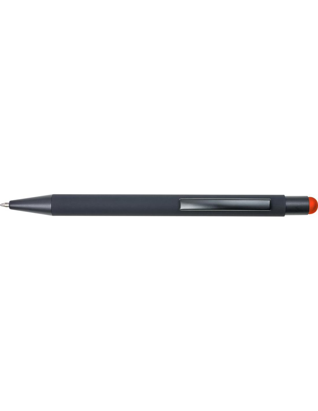 Bolígrafo de aluminio recubierto de caucho negro y con puntero táctil. Cuando se graba el cuerpo del bolígrafo a láser, el logo aparece colorido, brillante, metalizado y del mismo color que el puntero. Tinta azul.