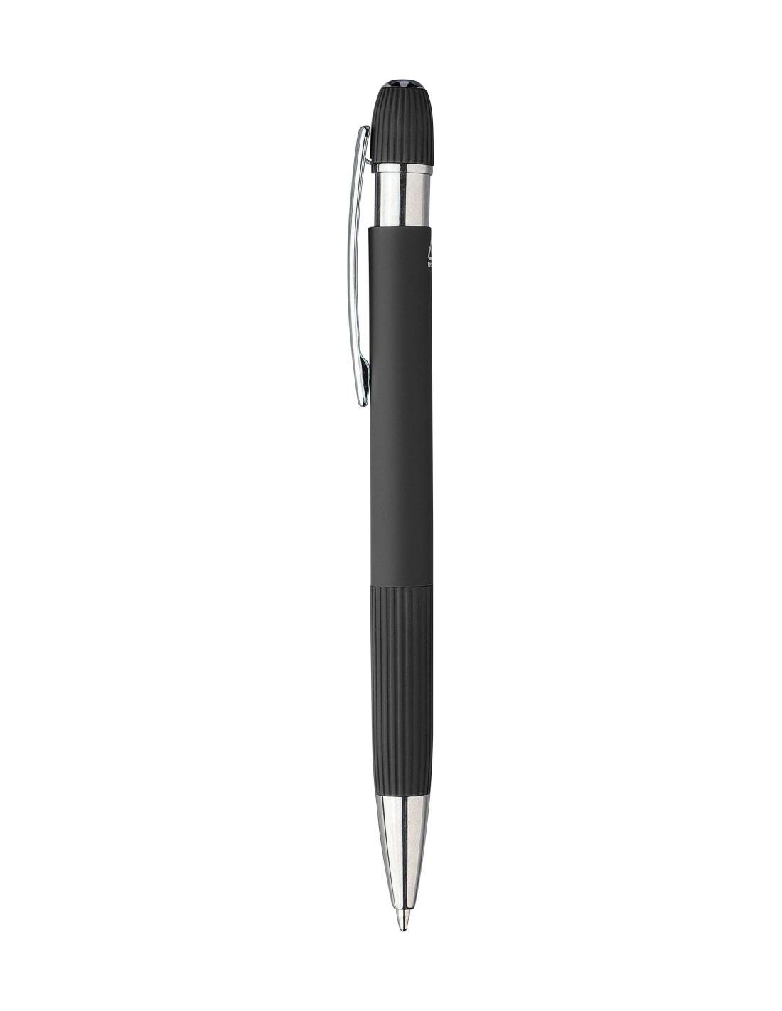 Bolígrafo de aluminio reciclado con acabado de caucho. Con detalles de rayas en la empuñadura y la parte superior, punta de plástico cromado y puls…