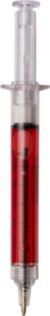 Bolígrafo de AS en forma de jeringuilla. Con líquido en el interior en color: transparente, azul, verde o rojo. Tinta negra.