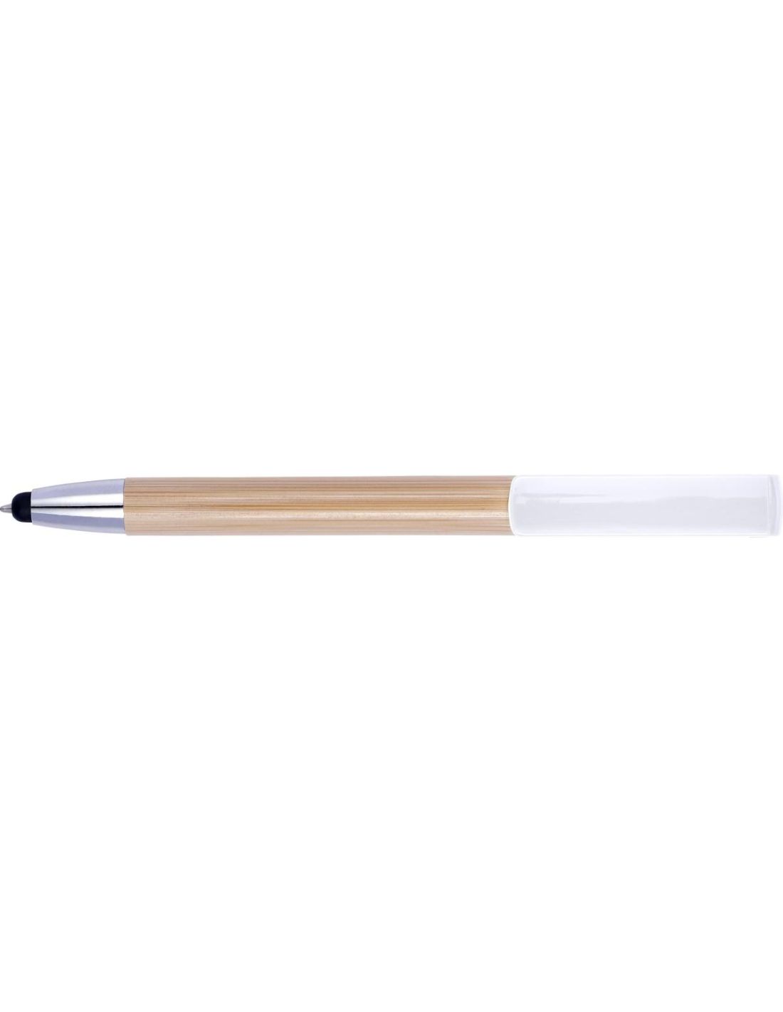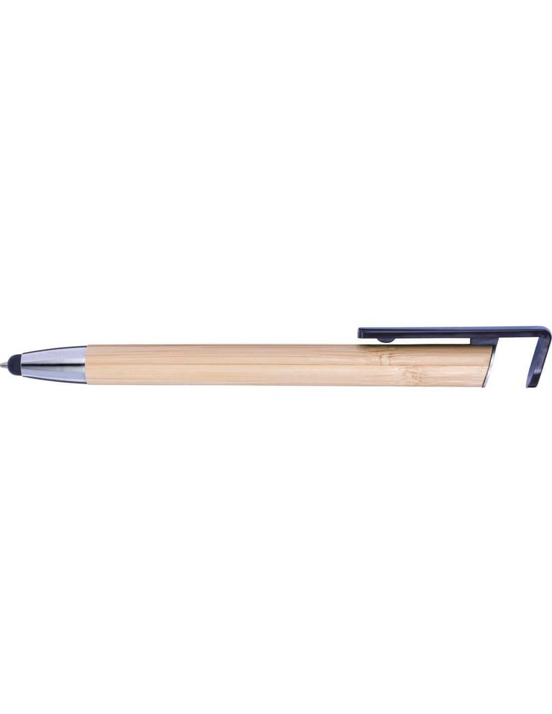 Bolígrafo de bambú con puntero táctil. Punta y clip de plástico. El clip pulsador funciona como soporte de móvil. Tinta azul.
