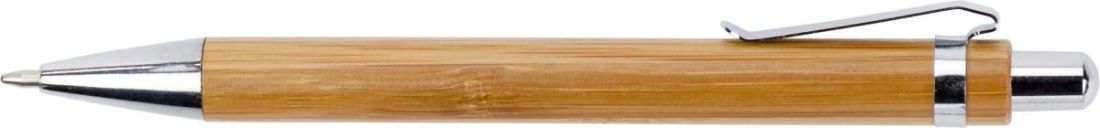 Bolígrafo de bambú con detalles en metal. Tinta azul.