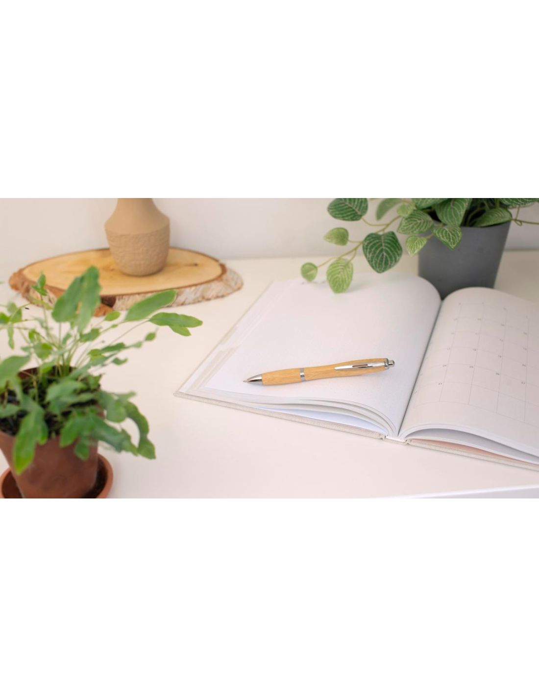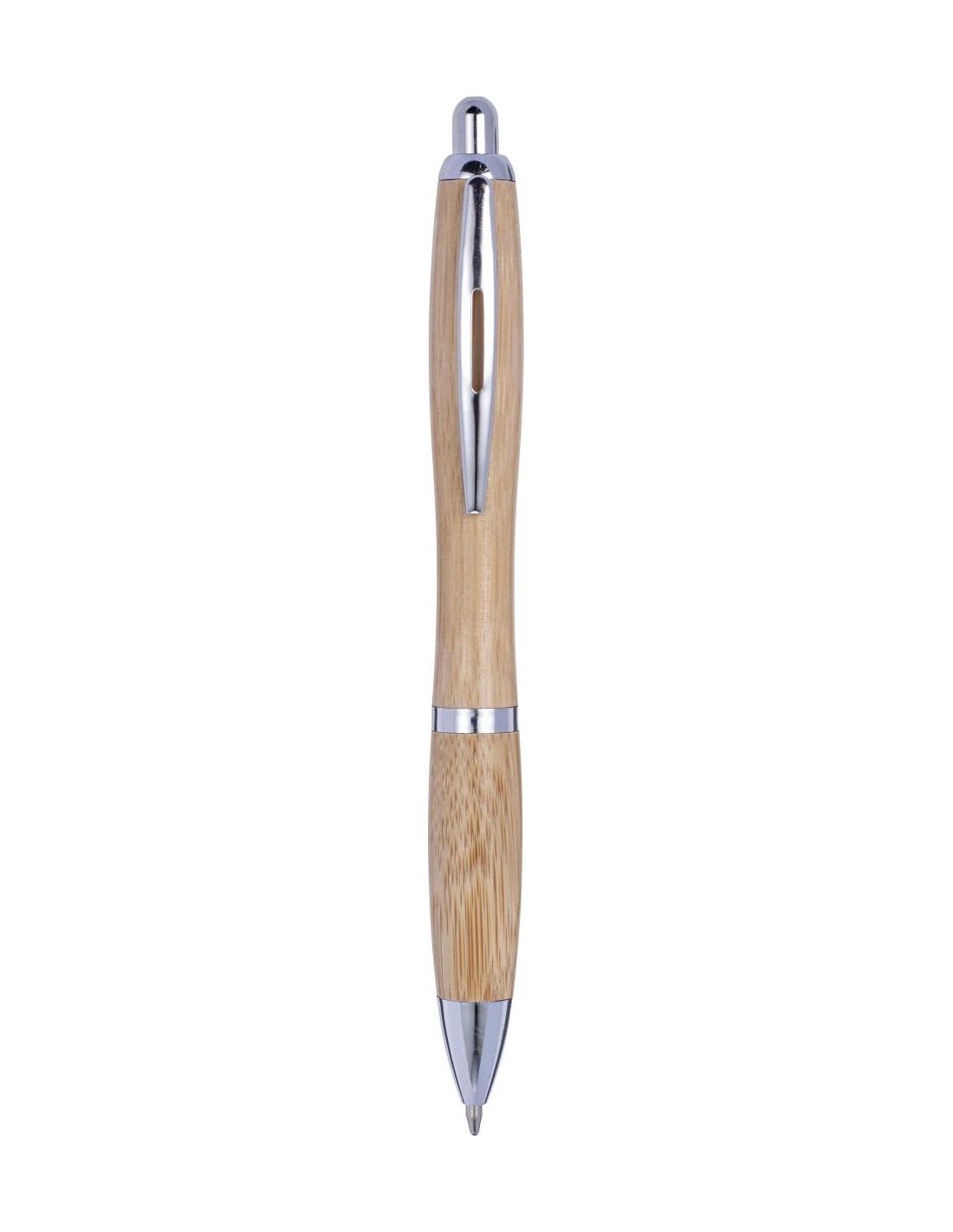 Bolígrafo de bambú con punta, pulsador, clip y aro en color plata. Tinta negra.