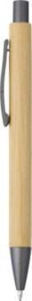 Bolígrafo de bambú con pulsador y punta de plástico, y clip metálico. Tinta azul.