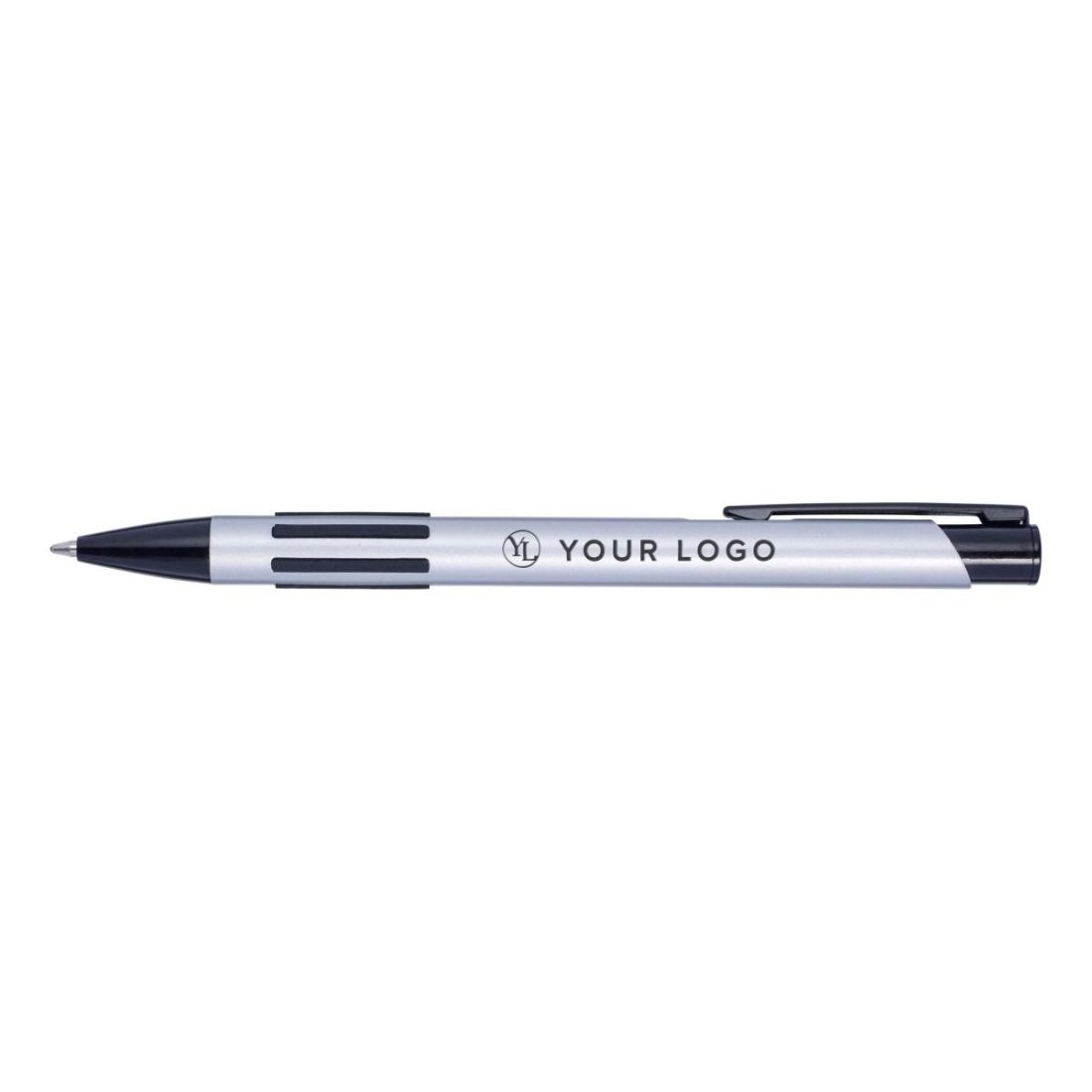 Bolígrafo metálico lacado con pulsador. La punta y el clip son negros y hacen juego con las tiras de caucho, que proporcionan un mejor agarre. Tinta azul.