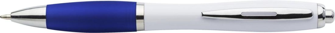 Bolígrafo de plástico con grip de color y terminales plateados. Tinta azul.