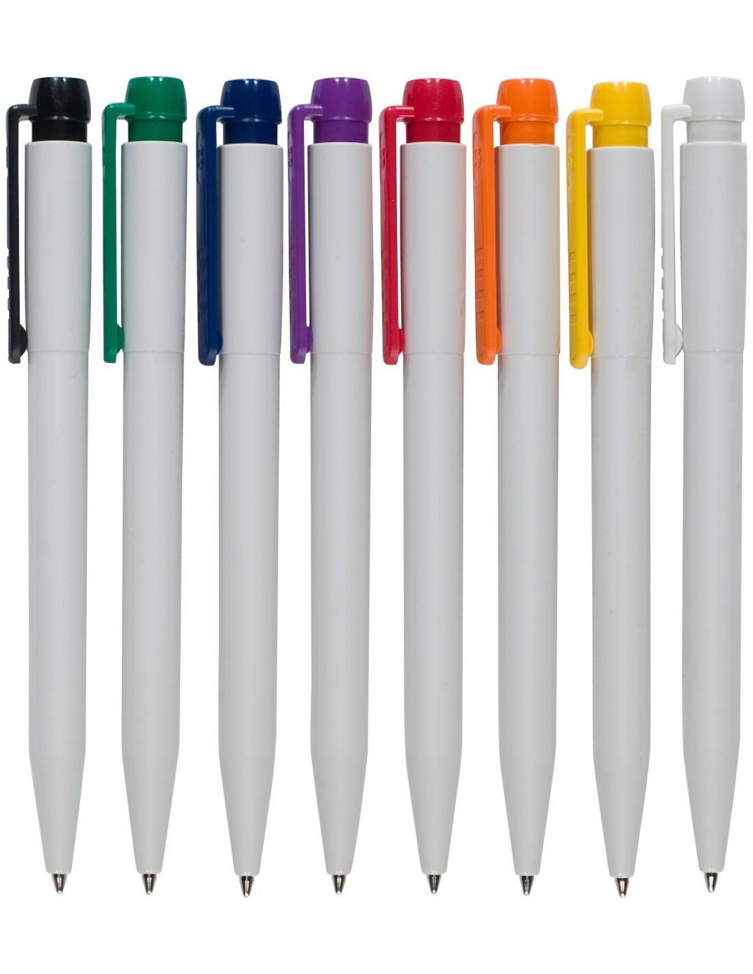 Bolígrafo Stilolinea Pier de plástico, con cuerpo blanco y clip y pulsador de color. Carga jumbo. Tinta azul alemana Dokumental.