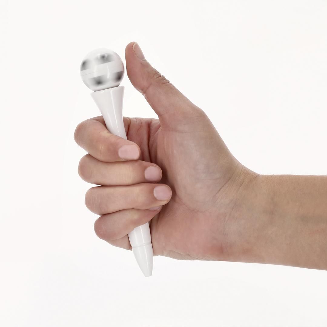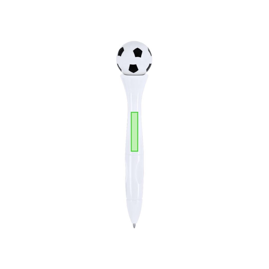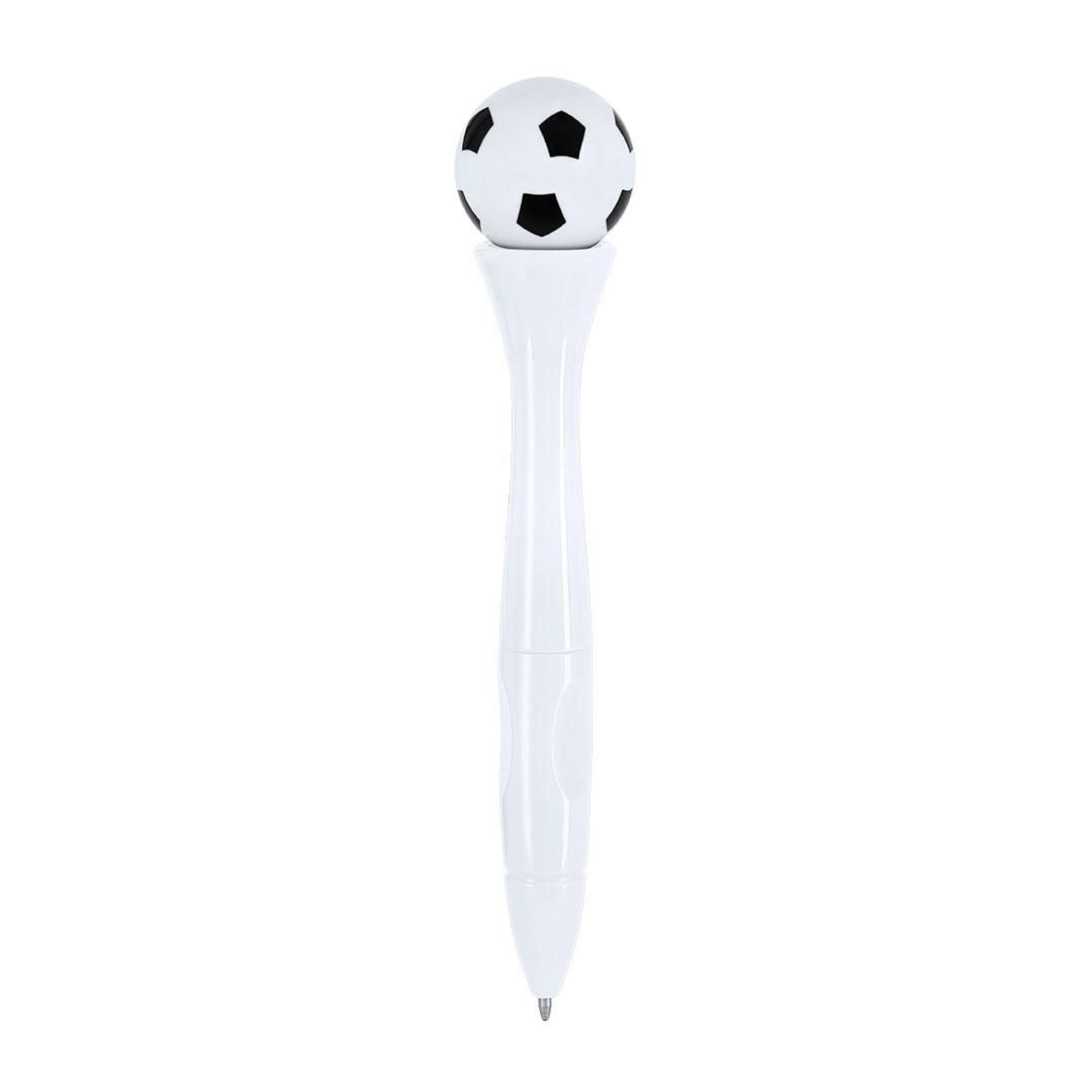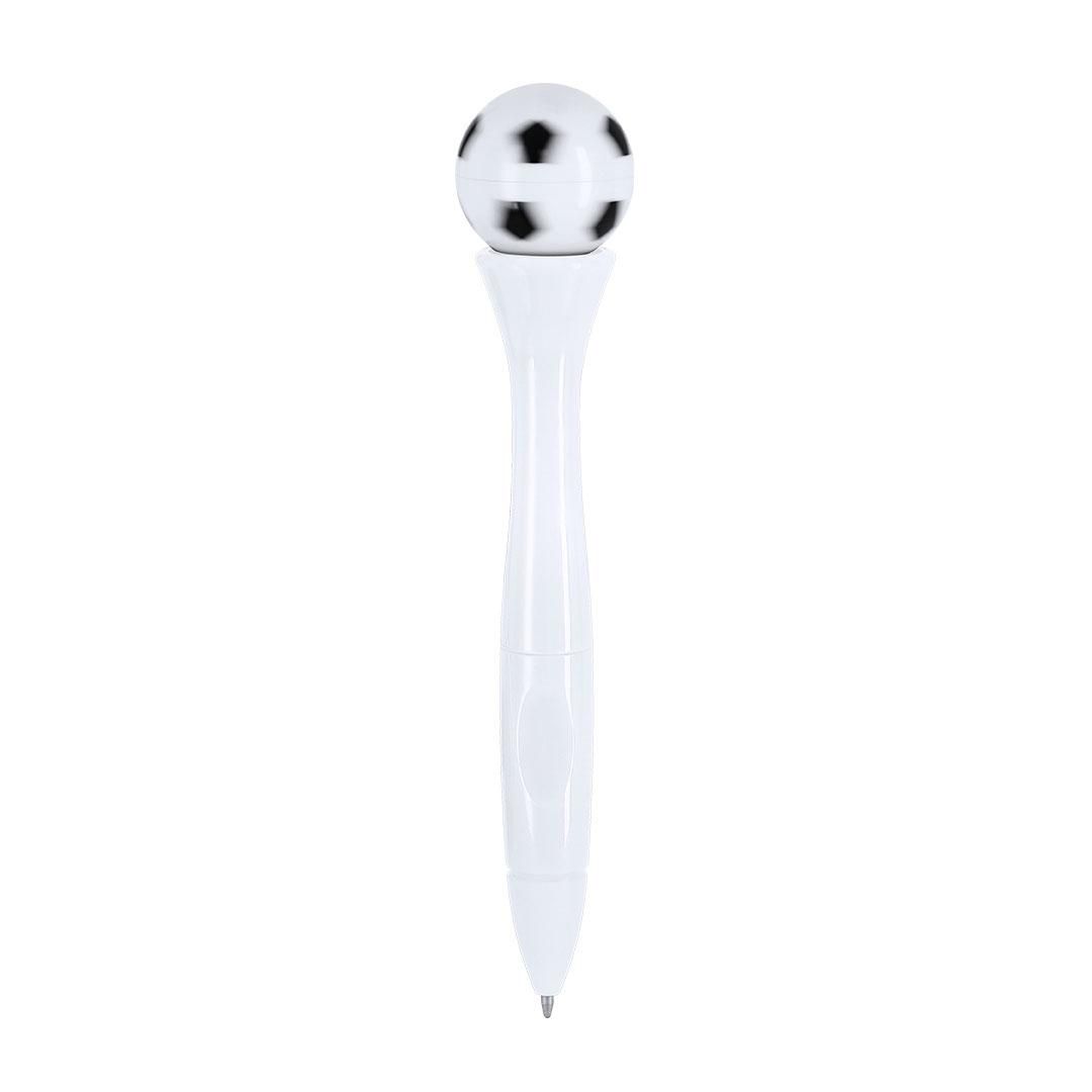 Bolígrafo antiestrés de mecanismo giratorio y diseño de balón de futbol. Cuerpo en acabado sólido brillante. Con tinta azul.