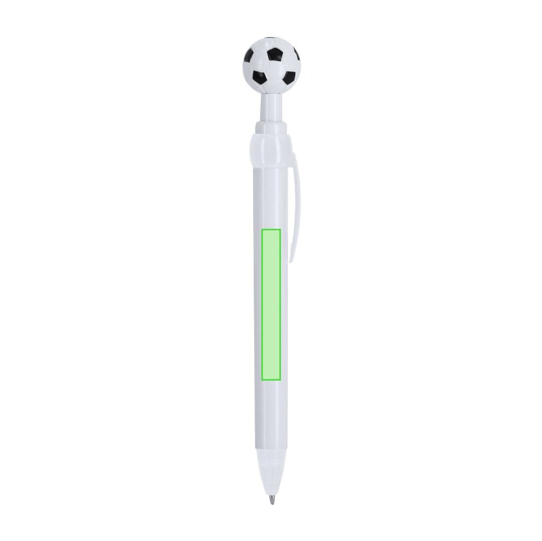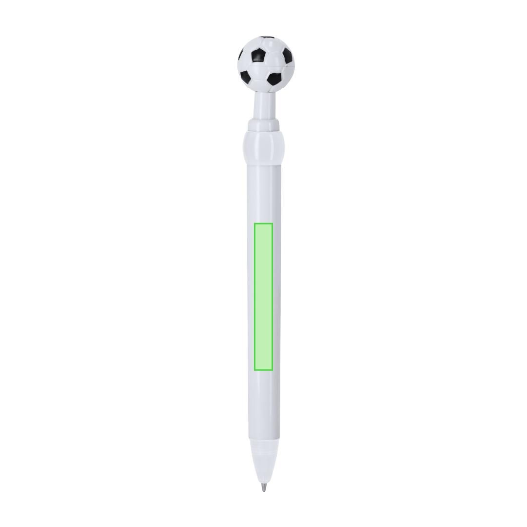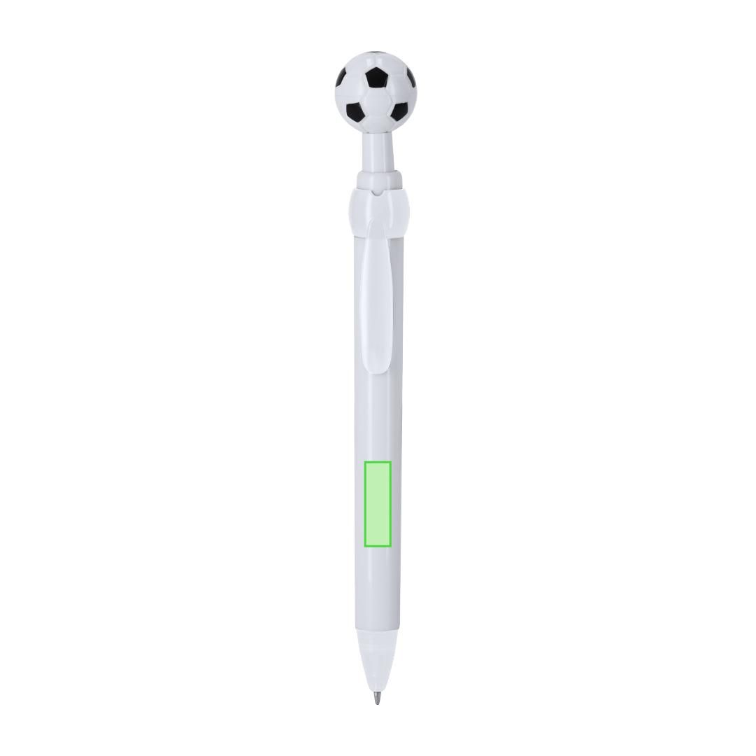 Bolígrafo de mecanismo pulsador fabricado en ABS. Pulsador con diseño de balón de futbol y cuerpo acabado brillante. En tinta azul.