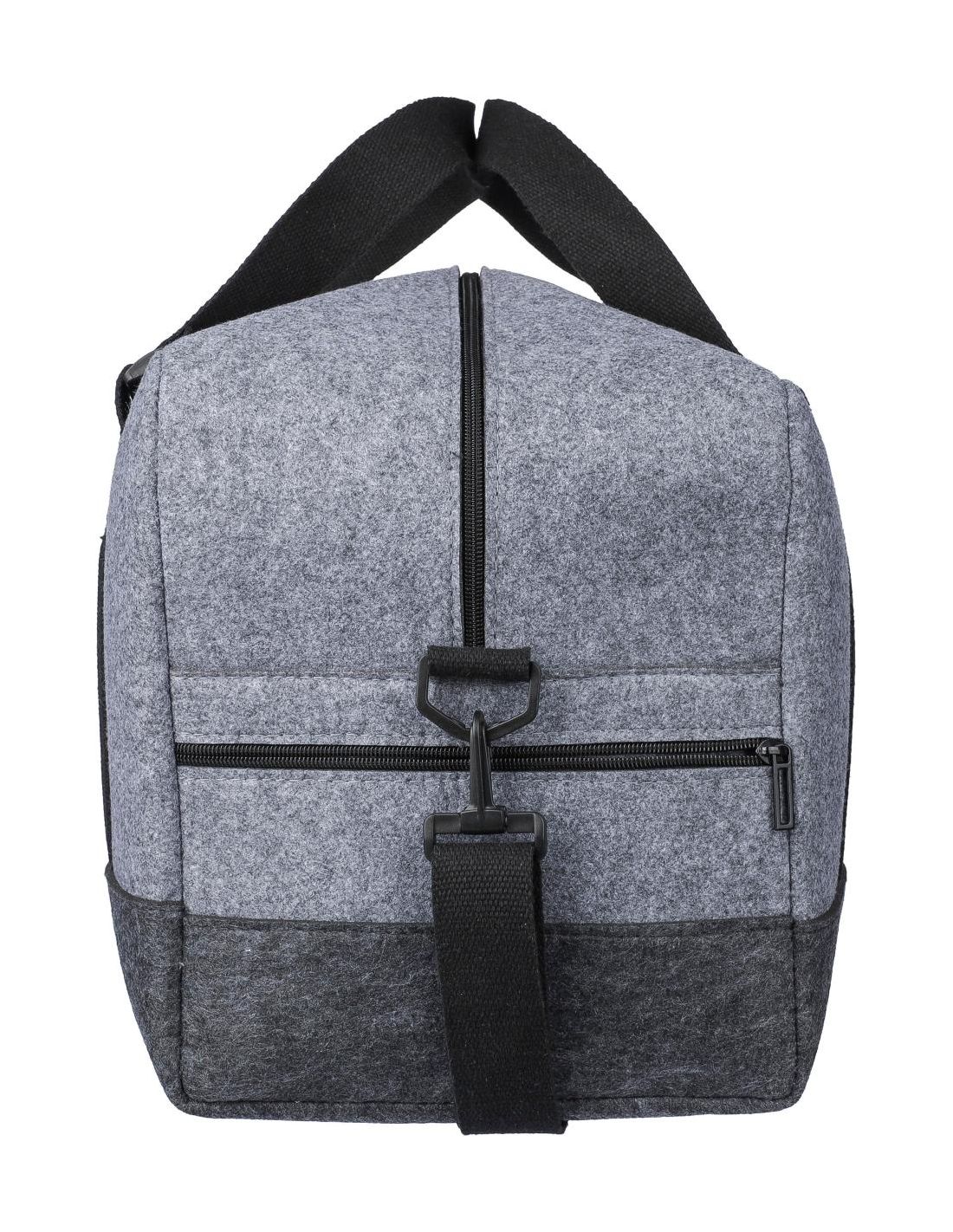 Bolsa de deporte de fieltro rPET con asas de lona y correa ajustable para el hombro. Cuenta con un gran compartimento con cremallera y un pequeño compartimento con cremallera en la parte delantera. Incluye una etiqueta indicando que es material reciclado. Capacidad: 30L. Capacidad de carga: 10 kg.