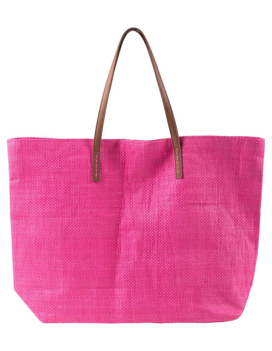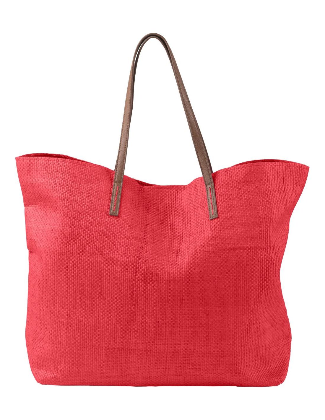 Bolso en colores brillantes, interior de tejido sin tejer laminado (80 gr/m²) y asas en color marrón de PU. Cierre botón.