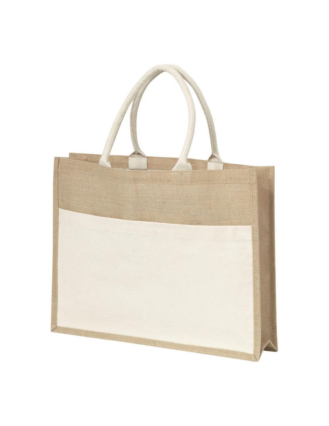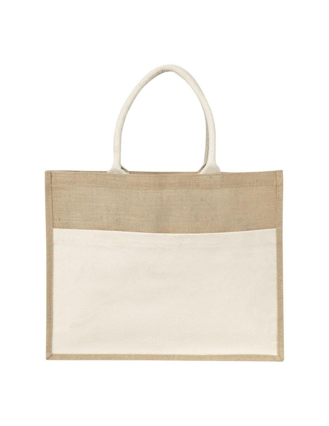 Bolsa de yute con interior de plástico, gran bolsillo frontal para imprimir y dos asas acolchadas de algodón.