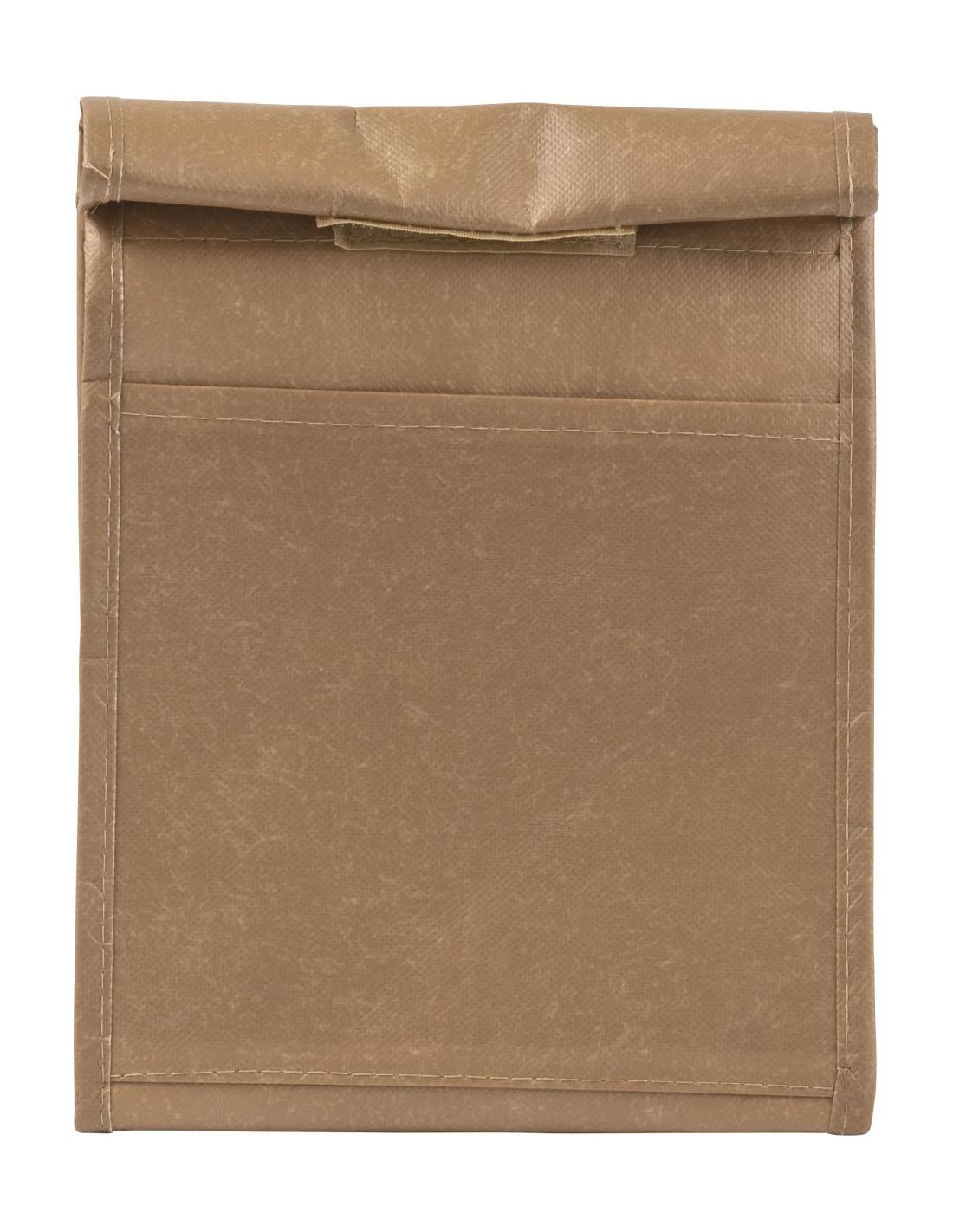 Bolsa isotérmica laminada de polipropileno no tejido (100 gr/m²) con aspecto de bolsa de papel. El interior está forrado con lámina aislante.