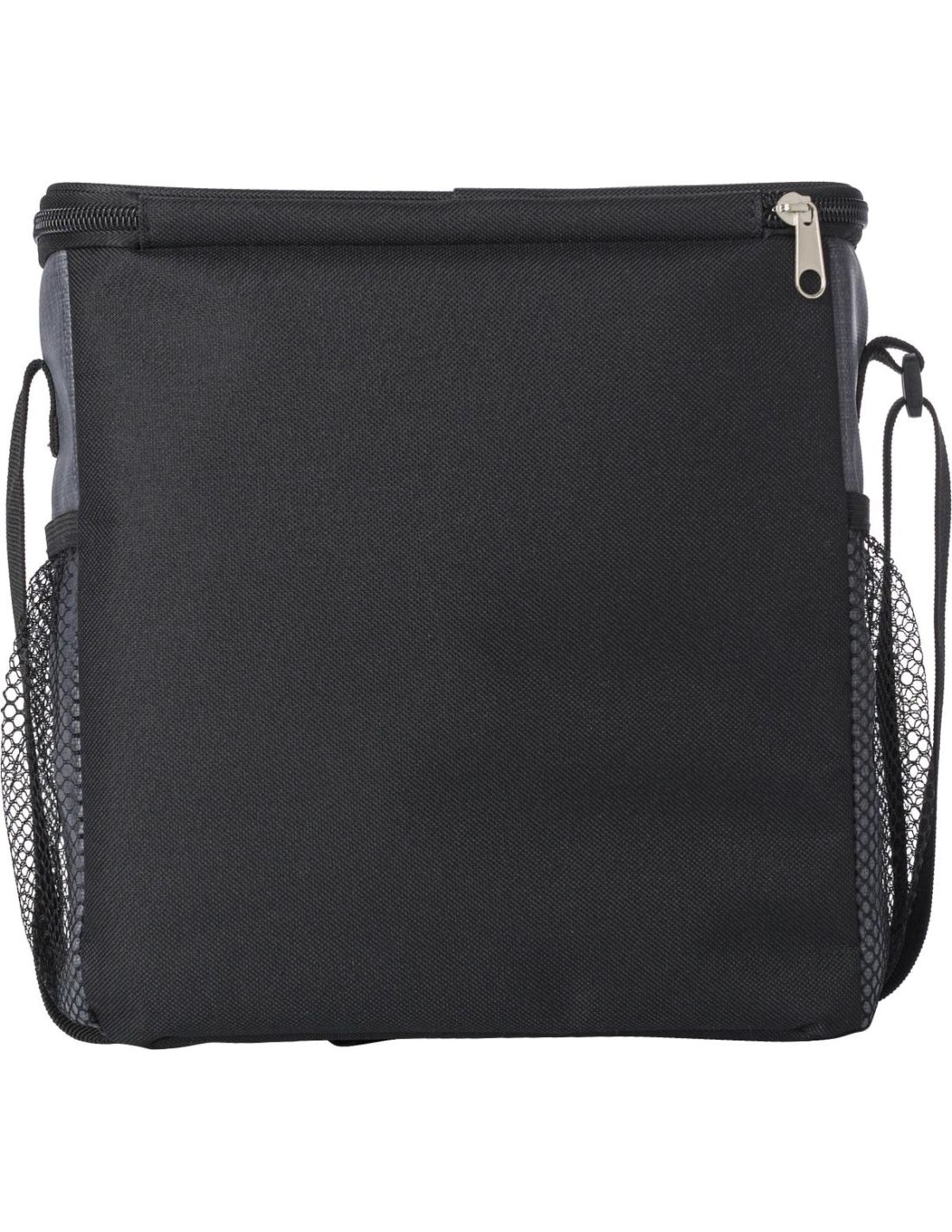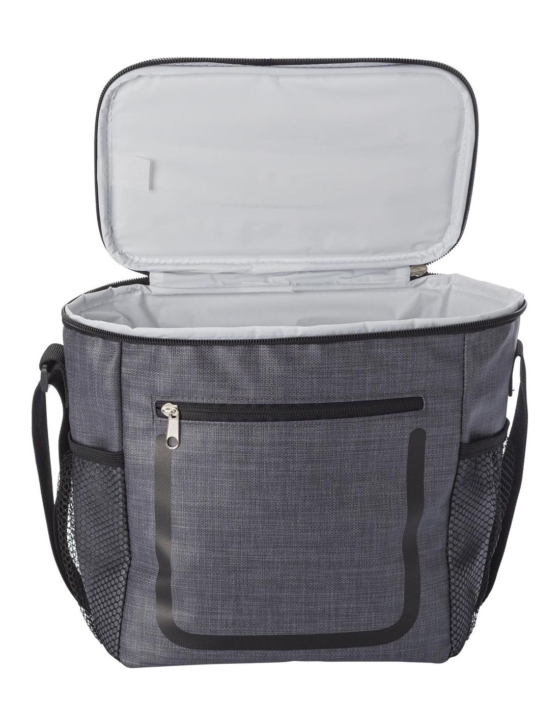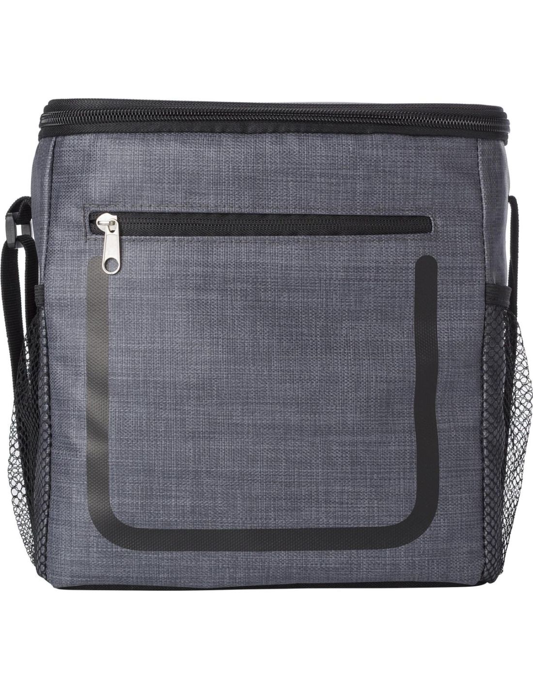 Bolsa isotérmica de PU con bolsillo frontal con cremallera y compartimentos de red en los laterales. El interior va forrado de papel de aluminio bl…