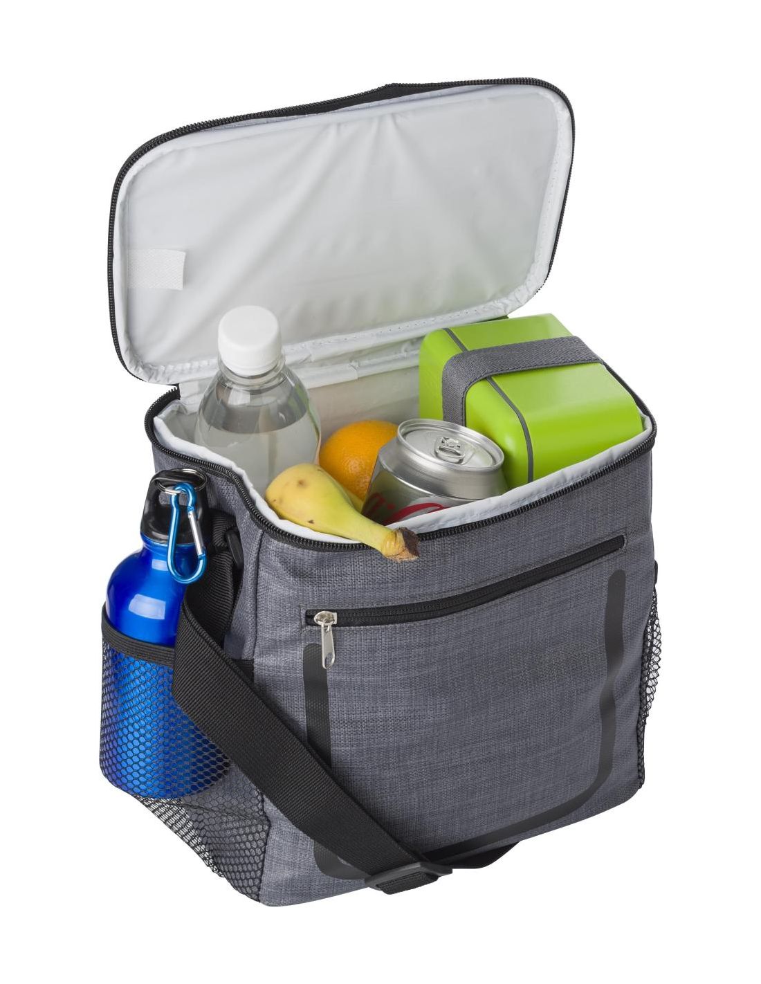 Bolsa isotérmica de PU con bolsillo frontal con cremallera y compartimentos de red en los laterales. El interior va forrado de papel de aluminio blanco. Tiene una correa ajustable.