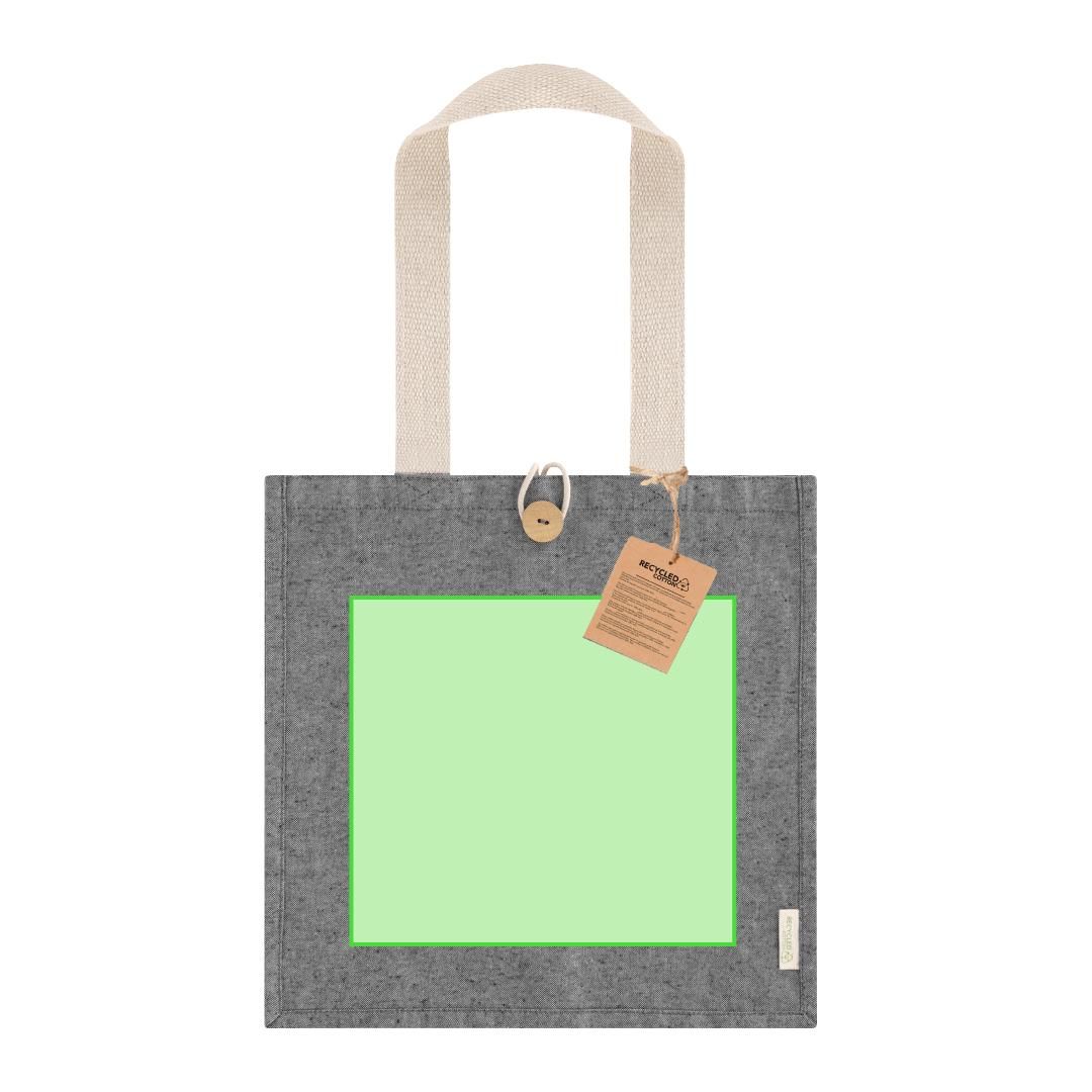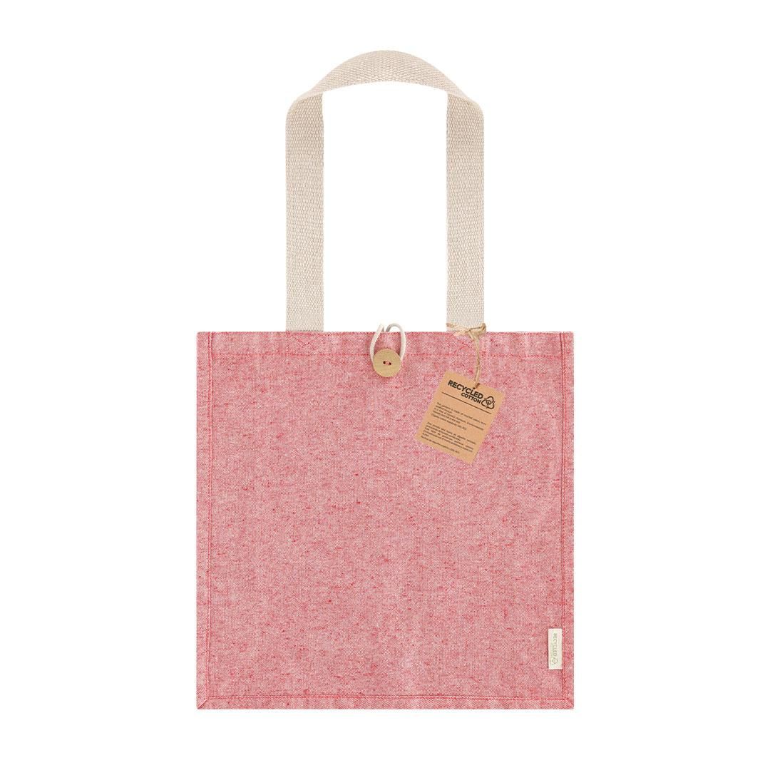 Bolsa con fuelle lateral y en base confeccionado principalmente en algodón reciclado de 300g/m2. Cuenta asas largas de 70 x 3,5 cm. Cierre superior con botón de madera. Incluye distintivo de Algodón Reciclado. Resistencia hasta 10 kg de peso.