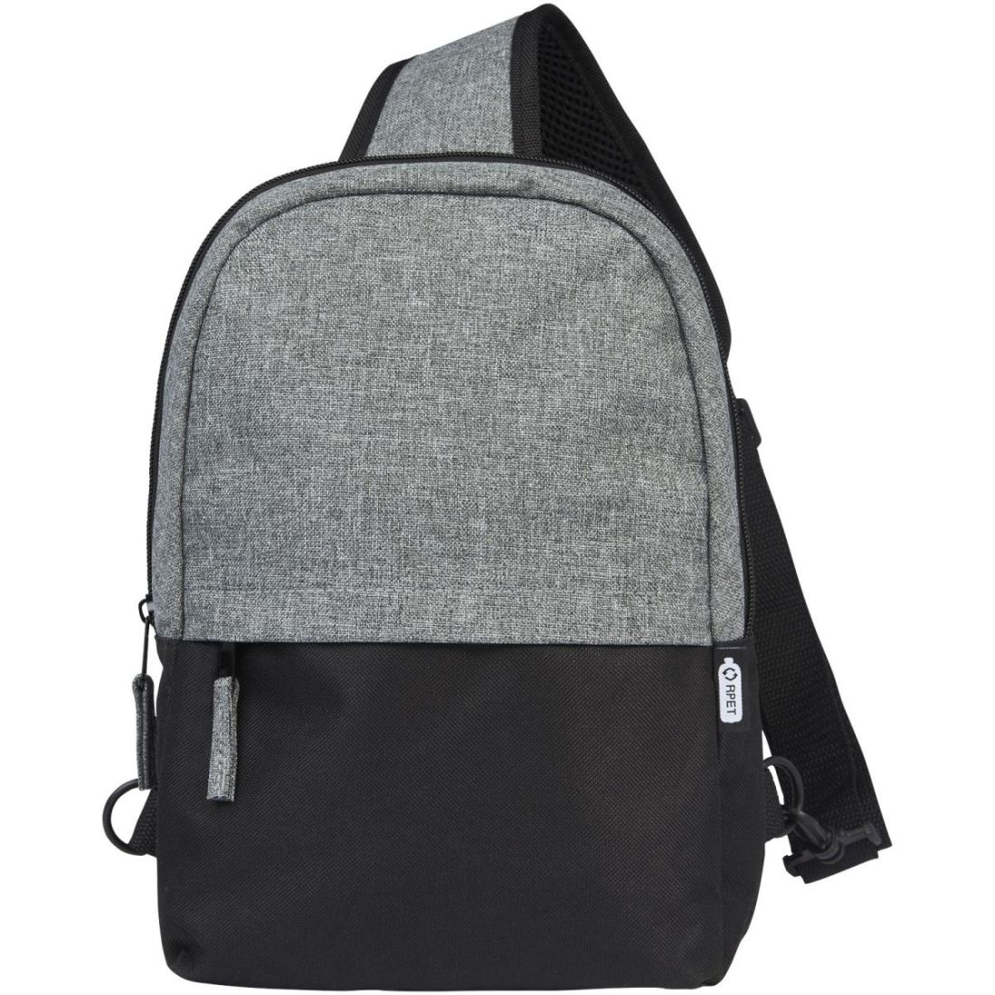 Fabricada con materiales 100 % reciclados en el exterior, la bandora reciclada GRS en dos tonos cuenta con un bolsillo frontal con cremallera, además de un compartimento principal con cremallera que contiene una funda para tabletas de 12 pulgadas. También tiene un bolsillo interno con cremallera para guardar objetos de forma segura y, gracias a su correa de hombro totalmente ajustable y acolchada, es cómoda de transportar.