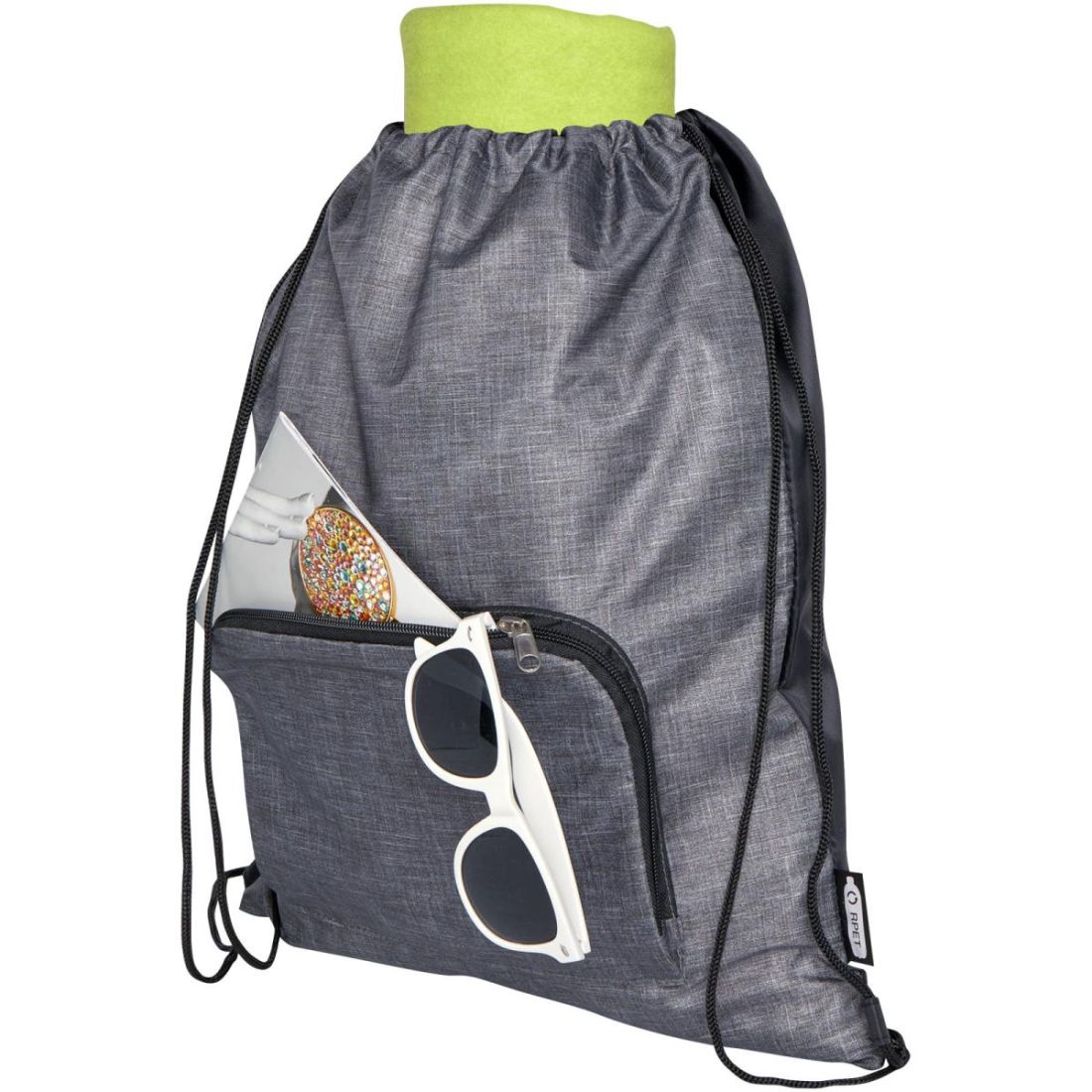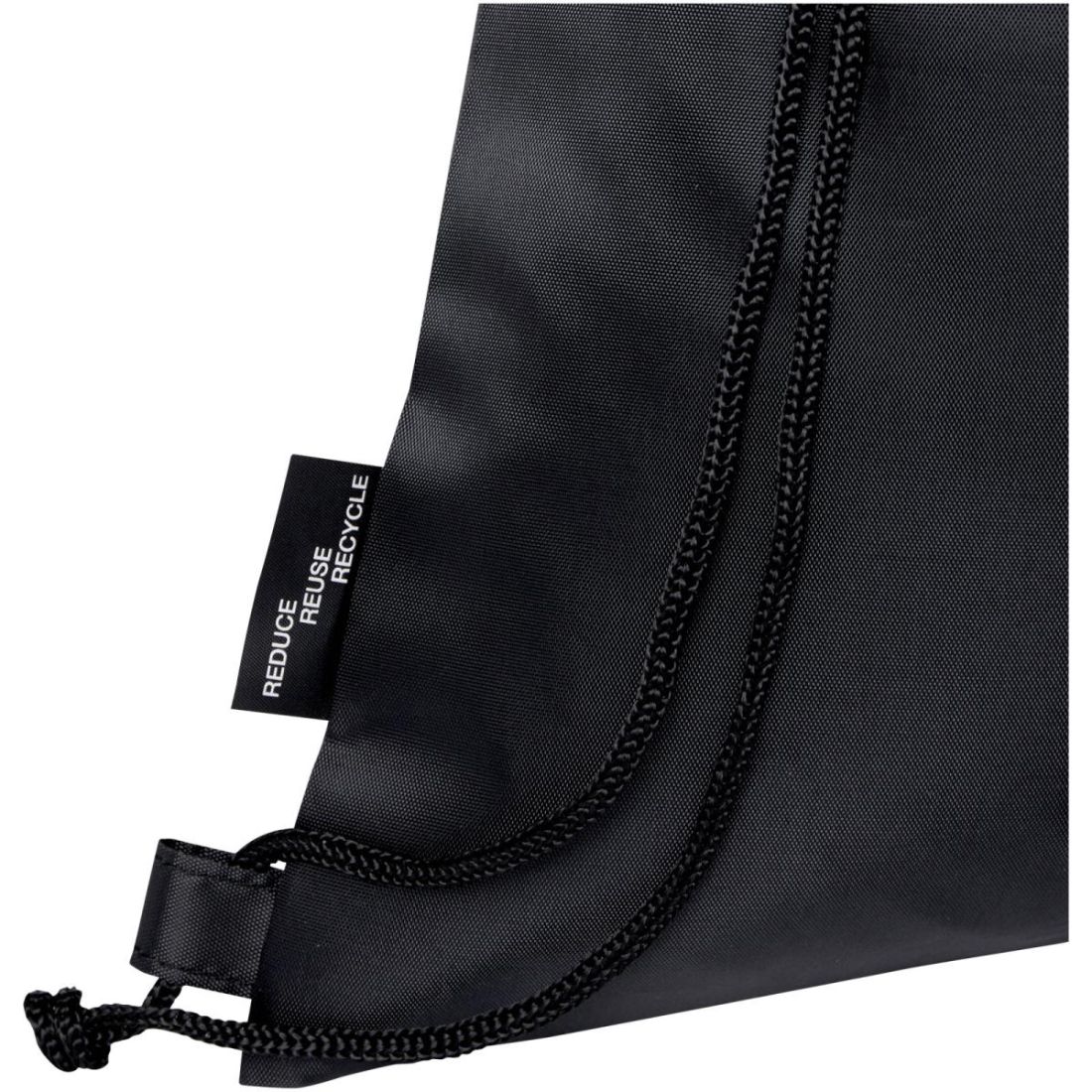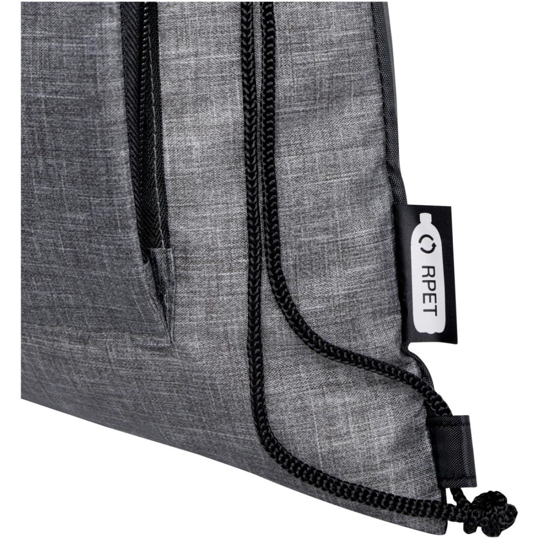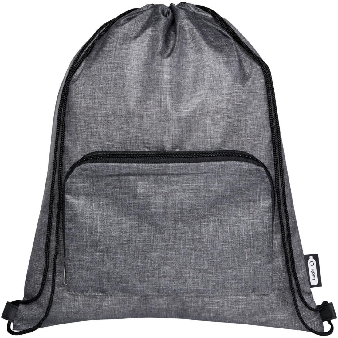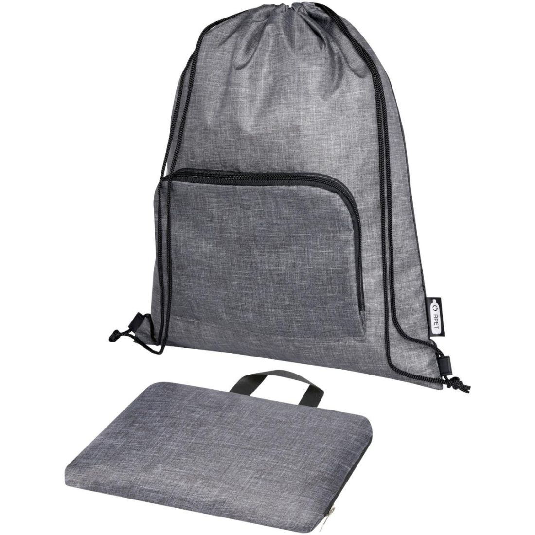 La bolsa con cordón plegable reciclada cuenta con un compartimento principal con cierre de cordón de ajuste y uno delantero con cremallera en el que la bolsa se puede plegar fácilmente para facilitar su transporte y almacenamiento.