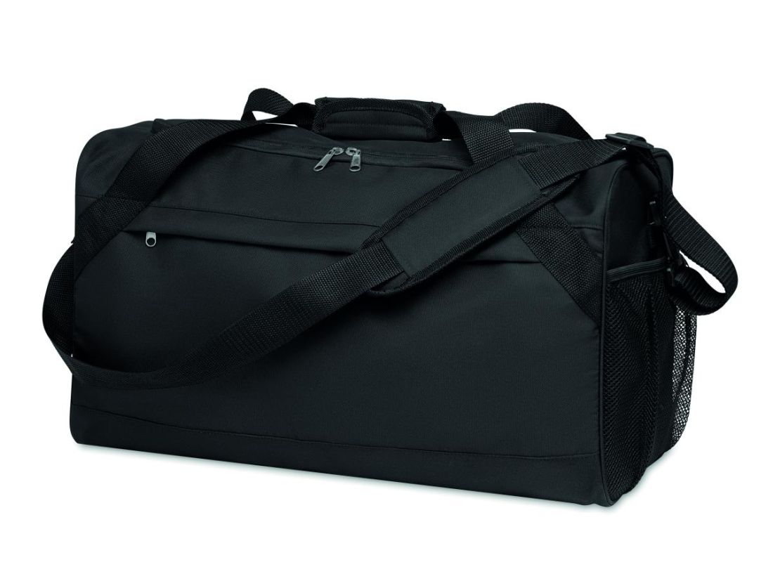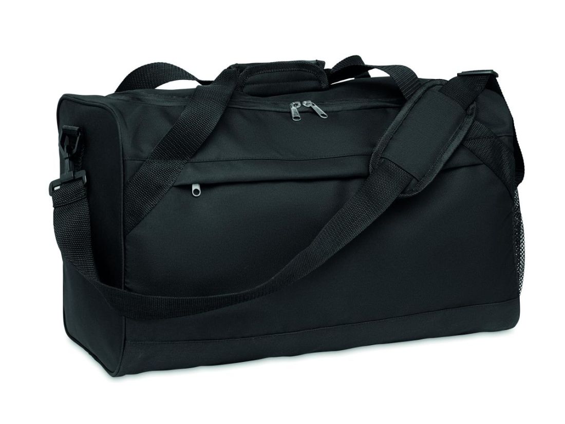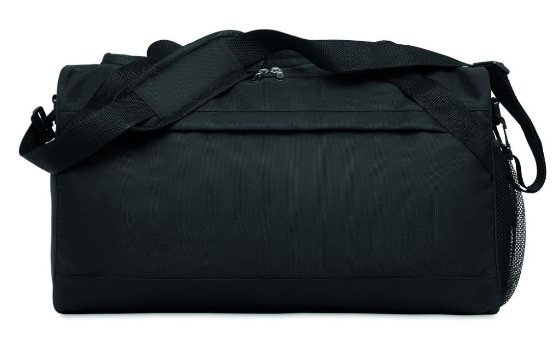 Bolsa de deporte o viaje de RPET 600D con bolsillo frontal e interior con cremallera y con cinta bandolera ajustable y desmontable.