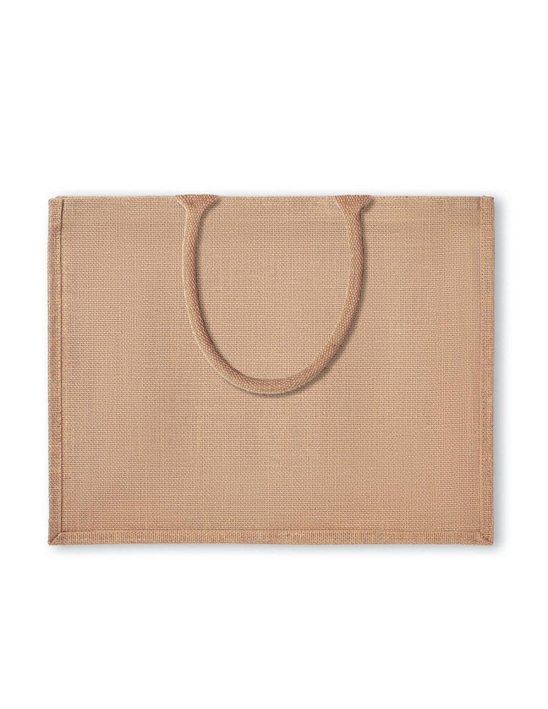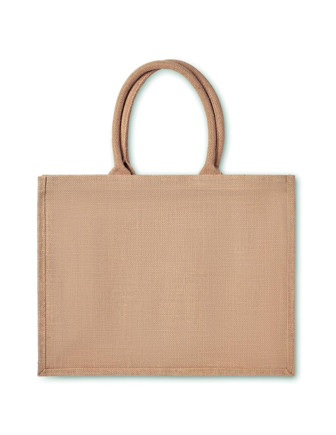 Bolsa de la compra en yute con interior laminado y asas cortas de algodón. Este producto cuenta con la certificación OEKO-TEX® STANDARD 100.
