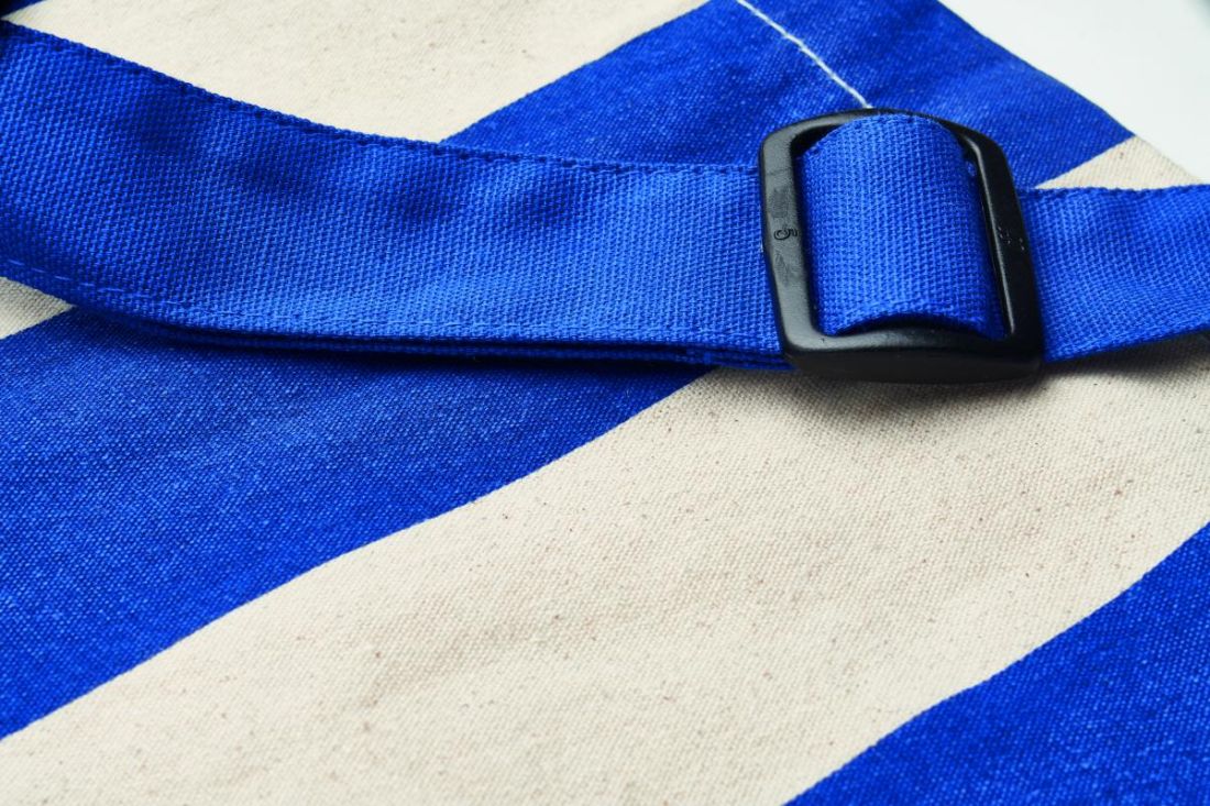 Bolsa de playa a rayas extra grande de algodón reciclado (80%) y poliéster reciclado (20%) de 280 gr/m² con bolsillo interior. Asas cortas y una gran bandolera ajustable.