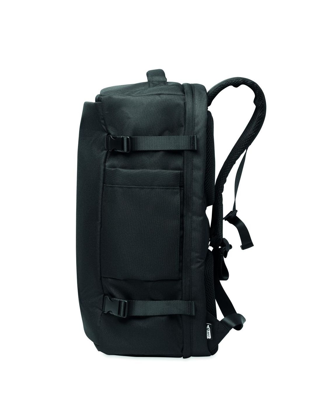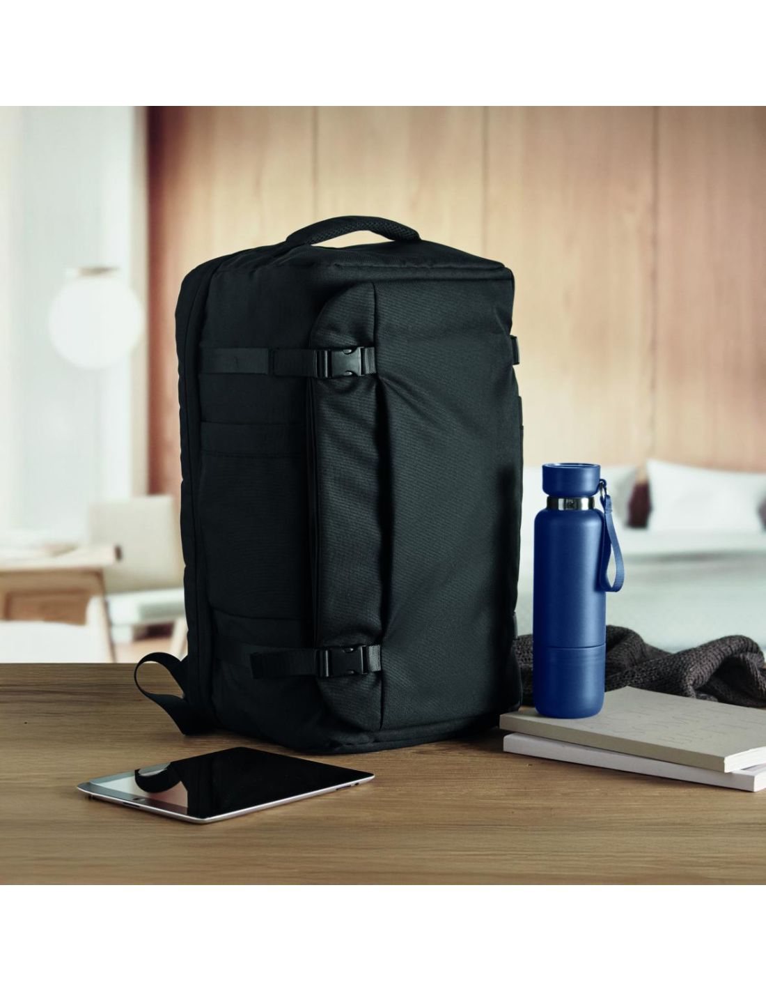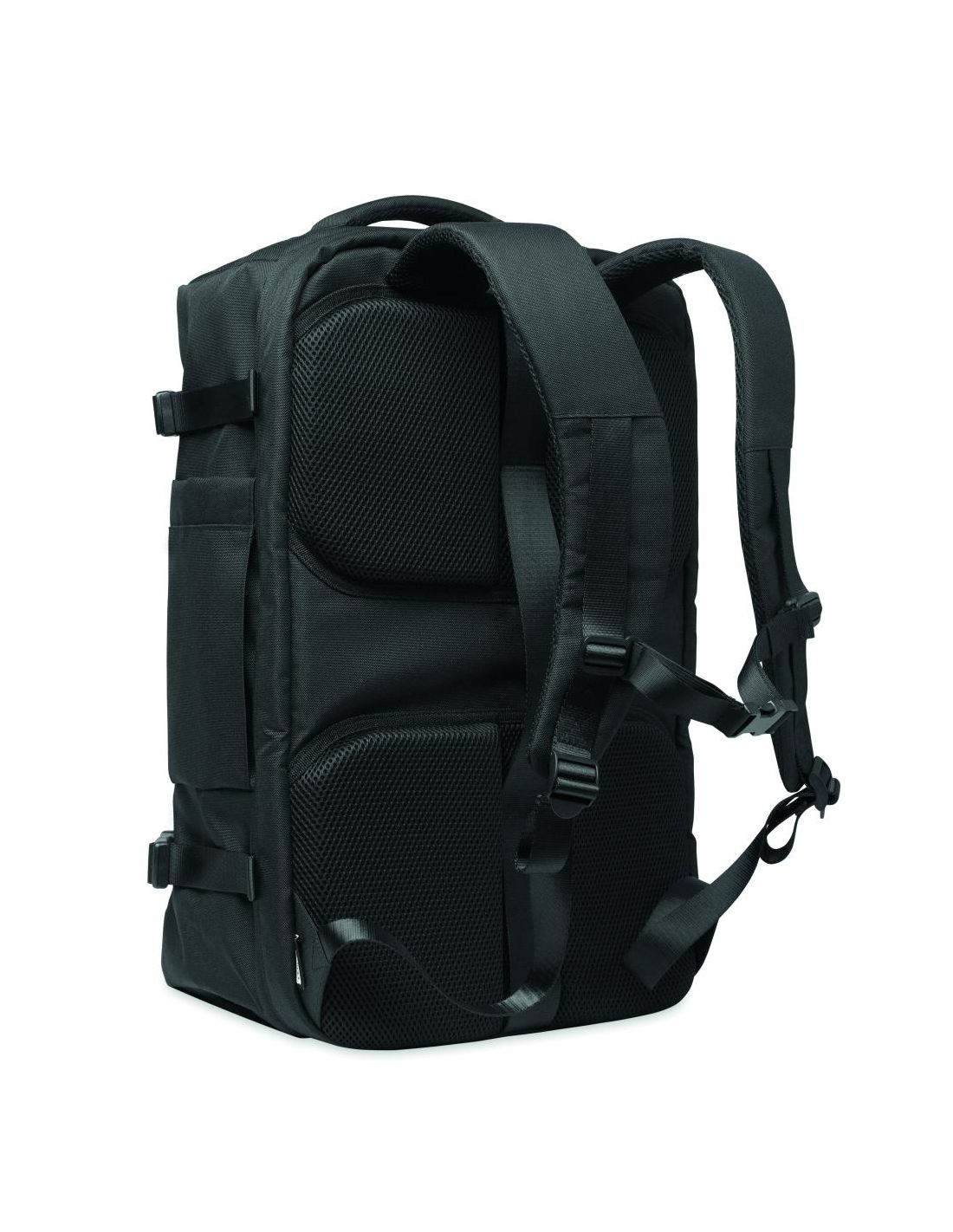 Mochila grande de viaje para portátil de 17'' en poliéster RPET 600D. Cuenta con varios compartimentos como uno principal para la ropa, dos acolchados para el portátil y la tableta y más. Panel trasero acolchado, correa para el hombro y asa de mano.
