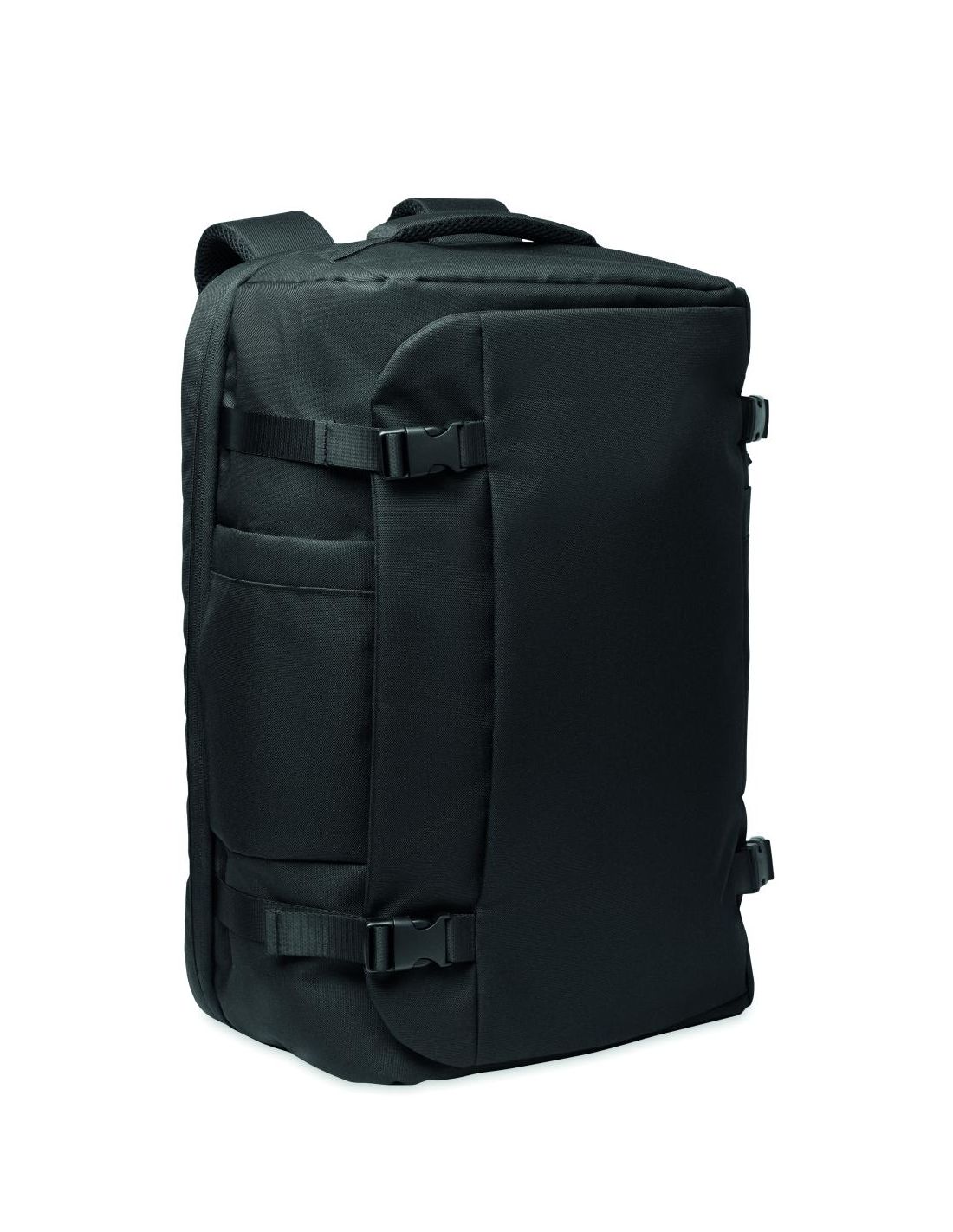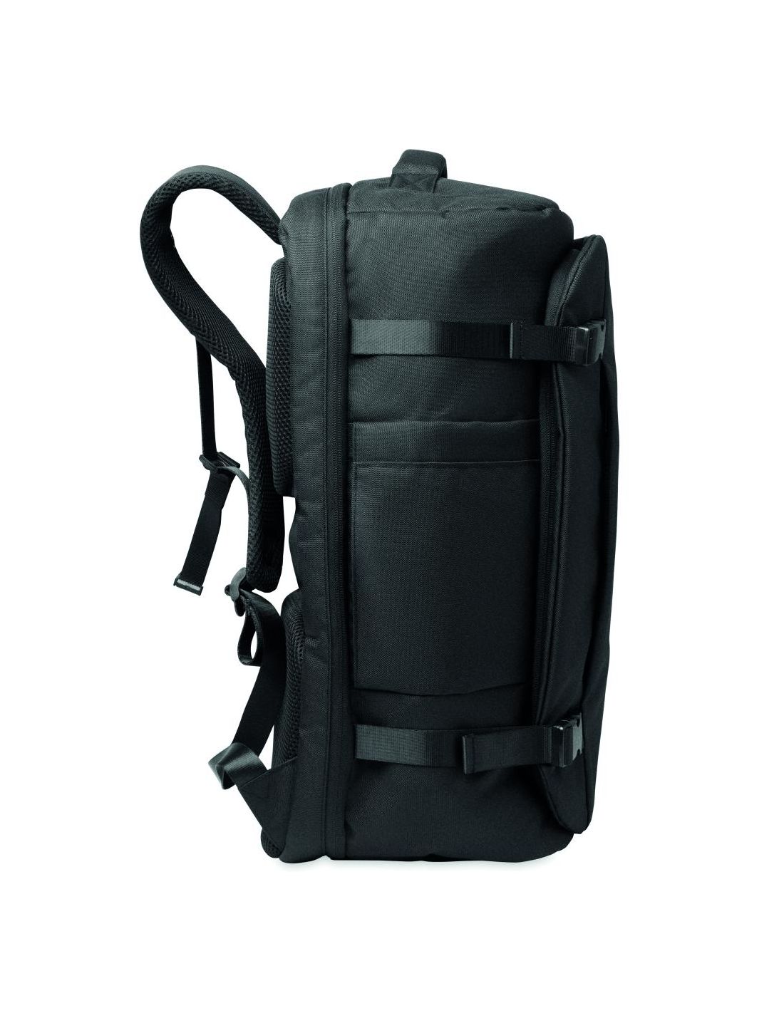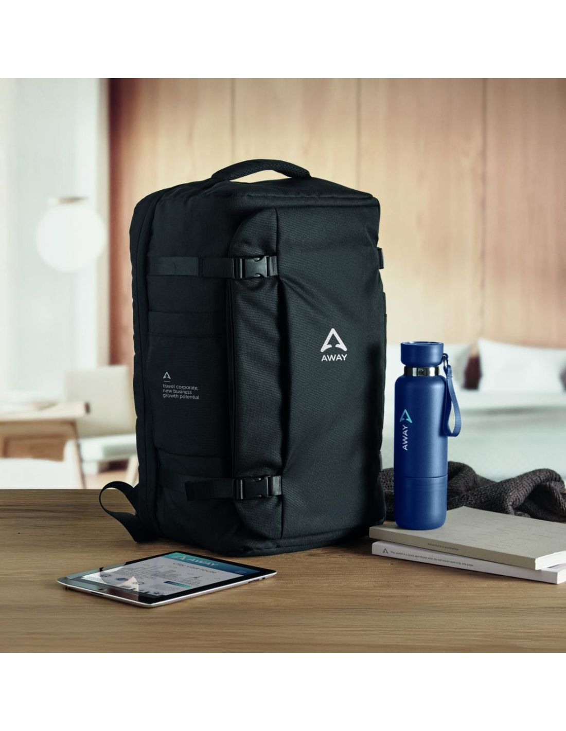 Mochila grande de viaje para portátil de 17'' en poliéster RPET 600D. Cuenta con varios compartimentos como uno principal para la ropa, dos acolchados para el portátil y la tableta y más. Panel trasero acolchado, correa para el hombro y asa de mano.