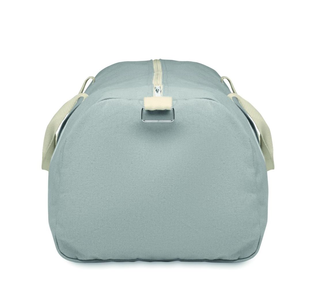 Bolsa de viaje en tejido reciclado (60% algodón reciclado, 40% poliéster reciclado) de 320 gr/m² con asas y cinta de algodón natural. Bandolera ajustable y desmontable.