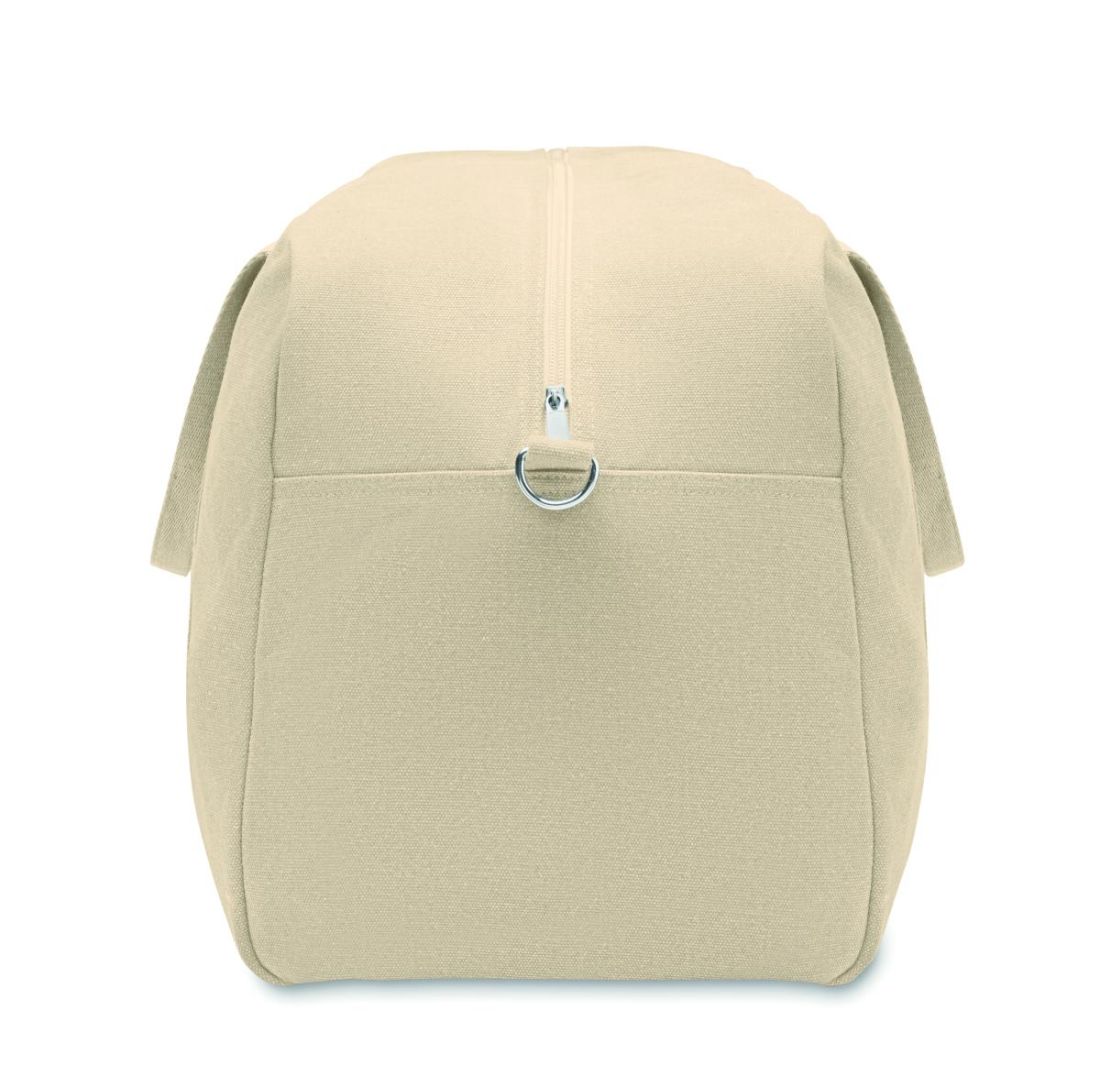 Bolsa de viaje en tejido reciclado de 450 gr/m² (60% algodón reciclado y 40% poliéster reciclado) con correa de algodón ajustable y desmontable.