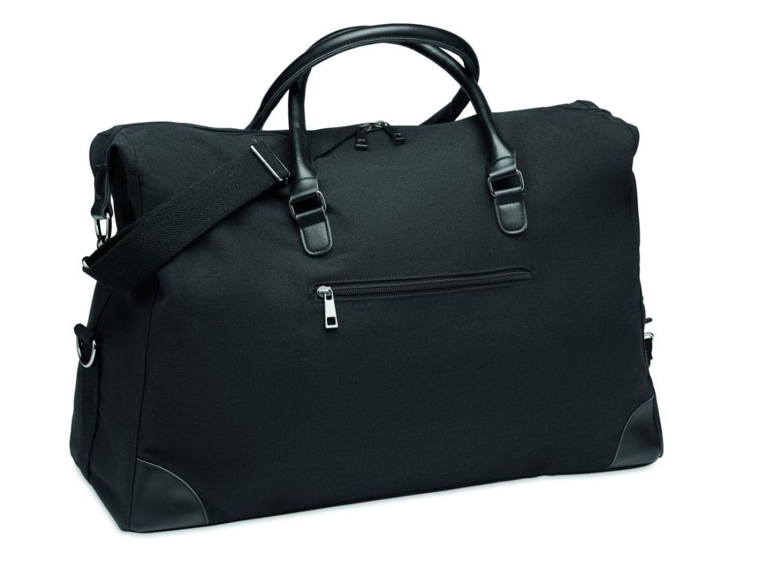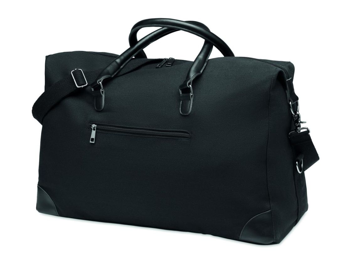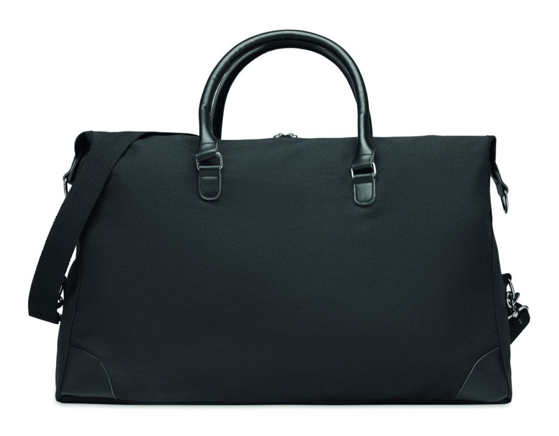 Bolsa de fin de semana en canvas de 340 gr/m² con detalles en PU reciclado. El forro es de RPET 210D. Incluye correas resistentes, ajustables y desmontables. Tamaño perfecto para el equipaje de mano.