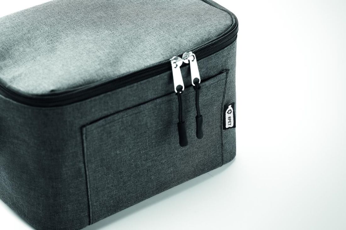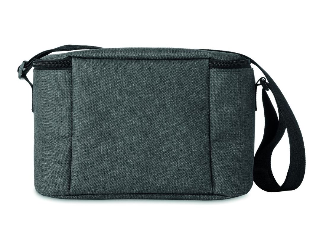 Bolsa nevera con capacidad para 6 latas de 330 ml de RPET 600D jaspeado con bolsillo frontal. Aislamiento: 0,15 mm de PEVA + 3 mm espuma. Capacidad 3L.