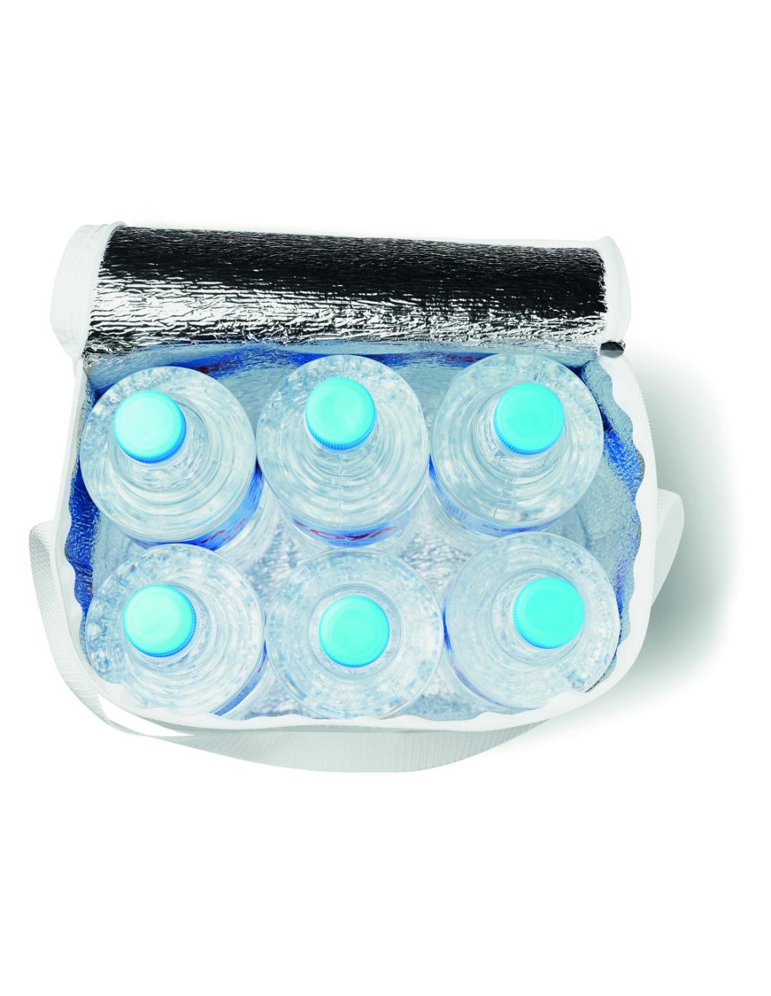 Bolsa nevera de poliéster 210D para botellas de 1,5 l. Capacidad para 6 botellas. Ribetes en non woven. 80gr/m2. Material de aislamiento: Papel de aluminio. Capacidad 12,5L.