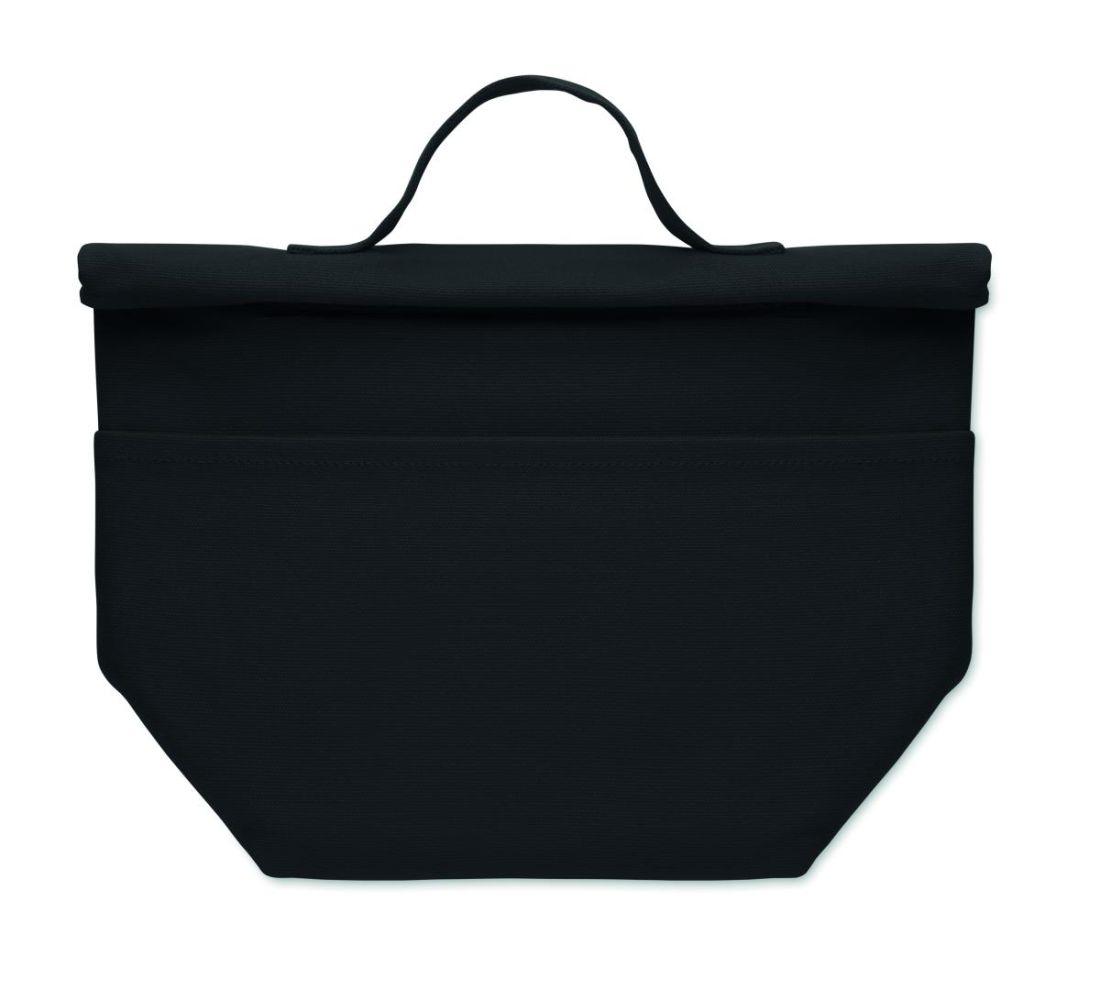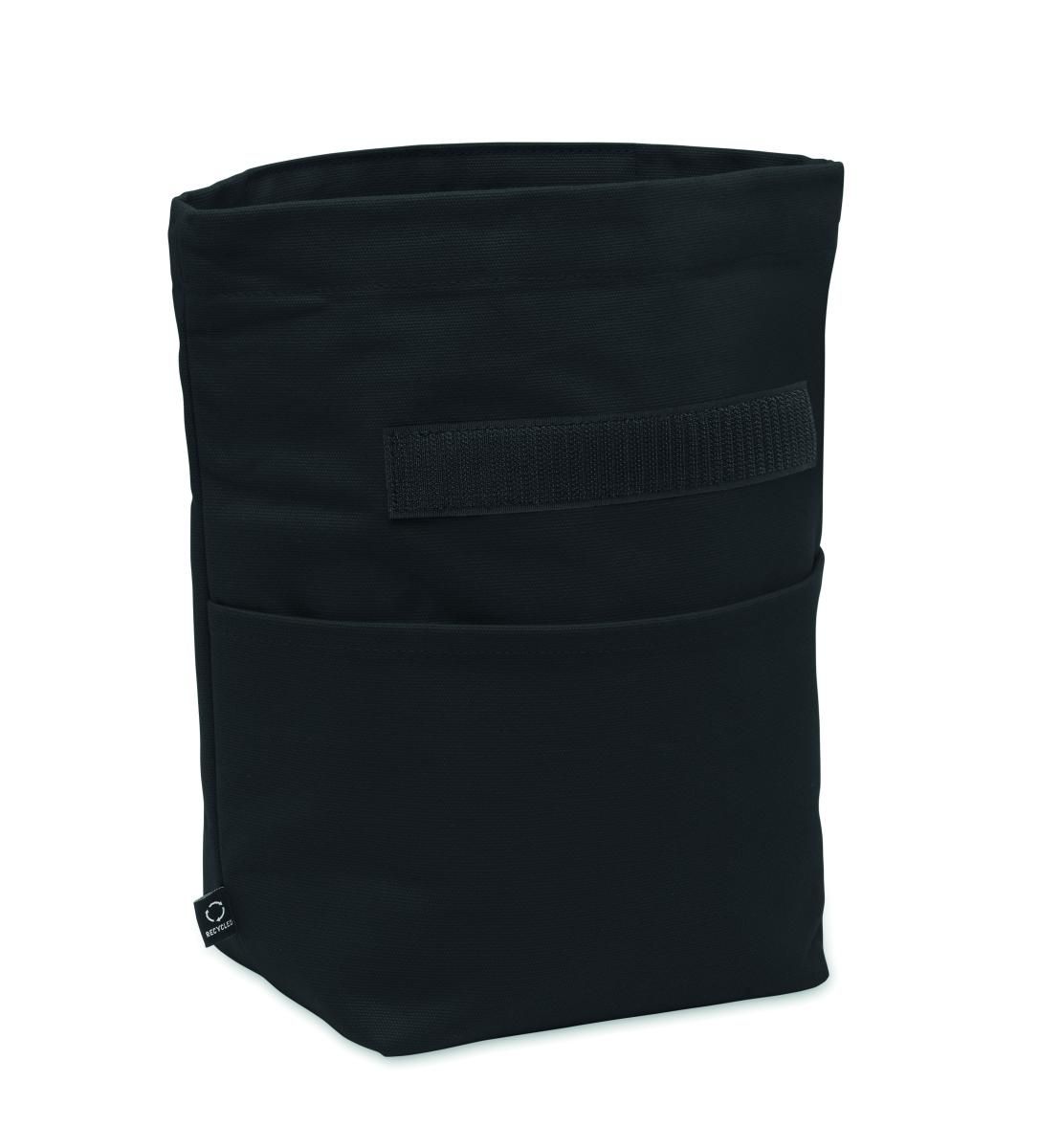 Bolsa nevera de algodón reciclado con cierre rolltop de gancho. Aislamiento de espuma de PE de 3 mm con PEVA de 12C.