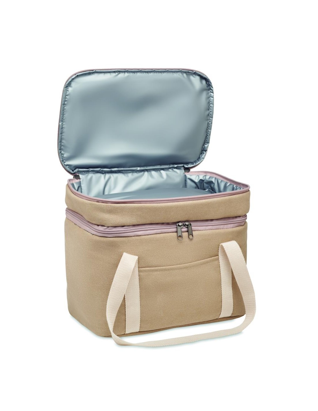 Bolsa nevera con 2 compartimentos en canvas lavado con cinta bandolera de algodón. 320 gr/m². Aislamiento: PEVA 15C con espuma de PE de 6 mm.