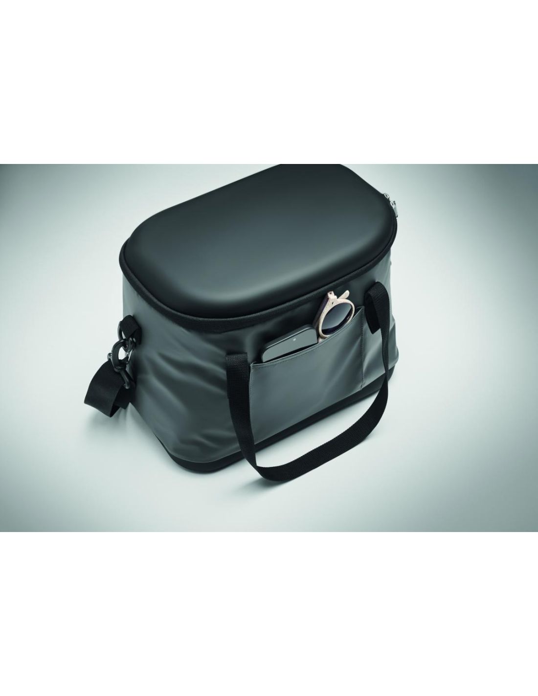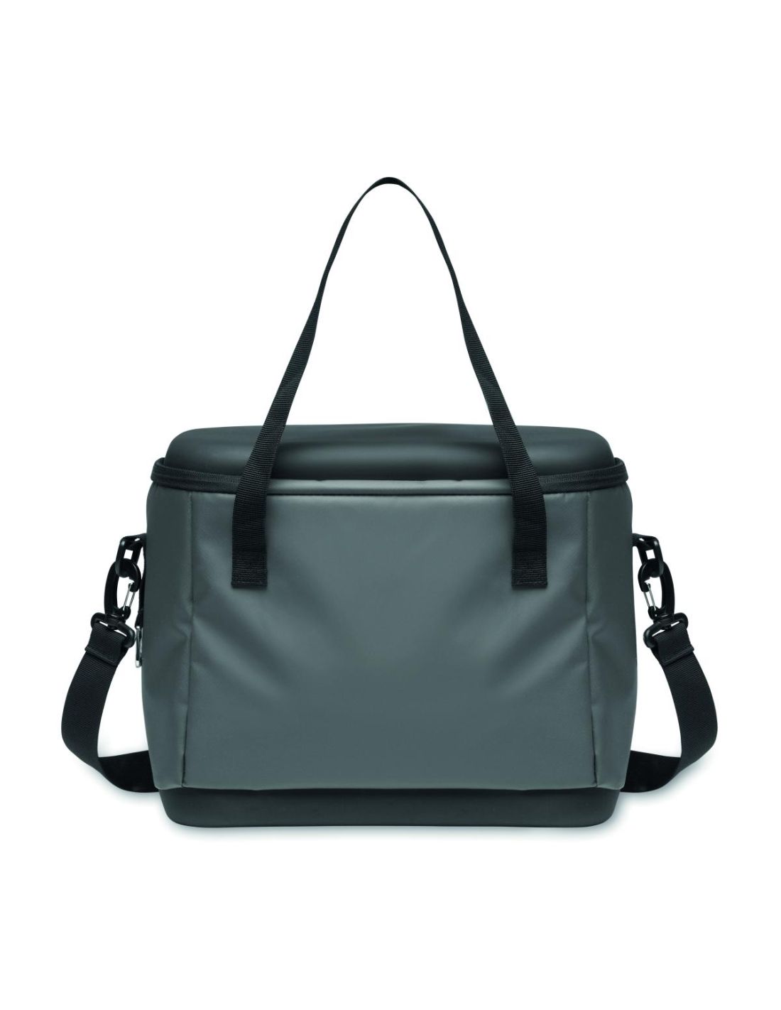 Bolsa nevera en lona 50C y parte superior/inferior en PEVA rígido. Contiene abrebotellas en lateral. Bolsillo frontal y bolsillo interior de malla. Material de aislamiento: Capa de espuma PE. Incluye 2 asas y 1 correa ajustable y desmontable. Capacidad 16L.