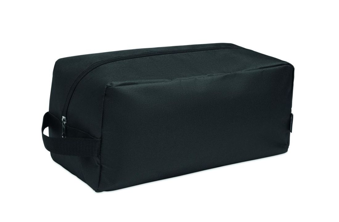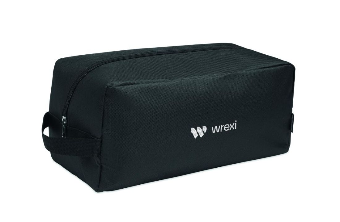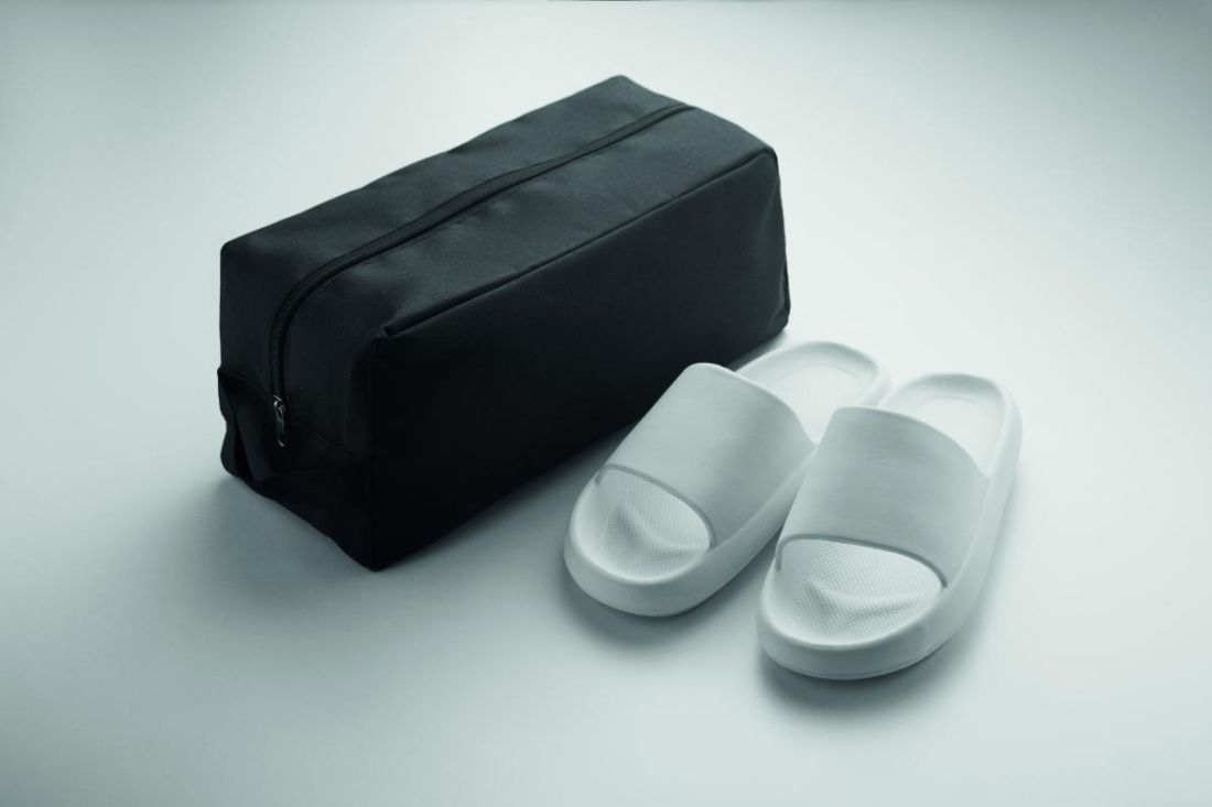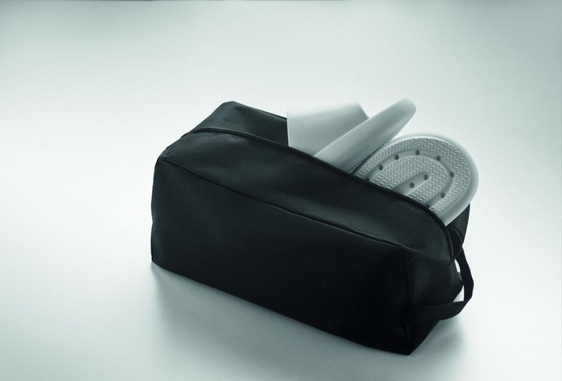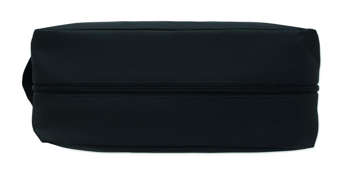 Bolsa para zapatos de poliéster RPET 600D con asa lateral y cremallera.
